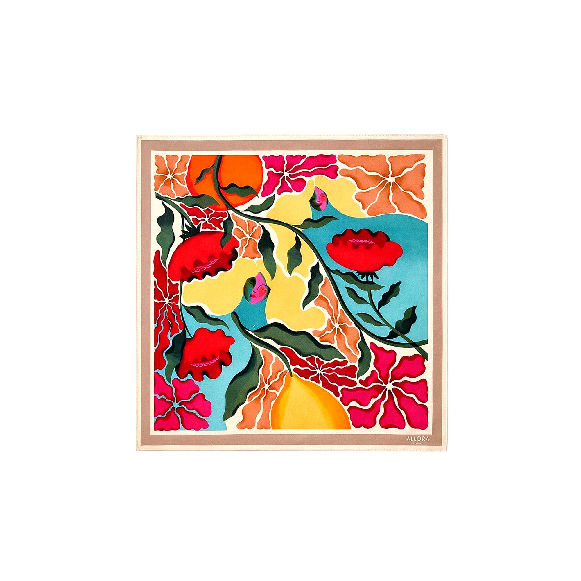 Felicità to stan umysłu. Po włosku oznacza szczęście, ale dla mnie to coś więcej. To sposób patrzenia na życie – z lekkością, z wdzięcznością za chwilę, która właśnie trwa. To zgoda na to, że nie wszystko musi być idealne, aby było piękne. Inspiracją do powstania tej apaszki były moje podróże do Włoch, szczególnie na południe. Tam życie płynie inaczej – wolniej, bardziej świadomie. Radość odnajduje się w drobiazgach: w słońcu, rozmowie, zapachu kawy czy w widoku morza. Na apaszce pojawia się rozmarzona dziewczyna – symbol marzeń i chwili zatrzymania. Kolory inspirowane są krajobrazem południowych Włoch: błękitem morza i nieba, cytrynami i pomarańczami pełnymi słońca, ciepłą ochrą budynków oraz kwiatami rozkwitającymi w śródziemnomorskim świetle. Felicità to apaszka o radości życia. O prostych przyjemnościach. O lekkości, stylu i odrobinie włoskiego luzu Agnieszka Pawlina Co-owner ALLORA BE UNIQUE Autorski projekt ALLORA BE UNIQUE we współpracy z ilustratorką Mary Zaleską