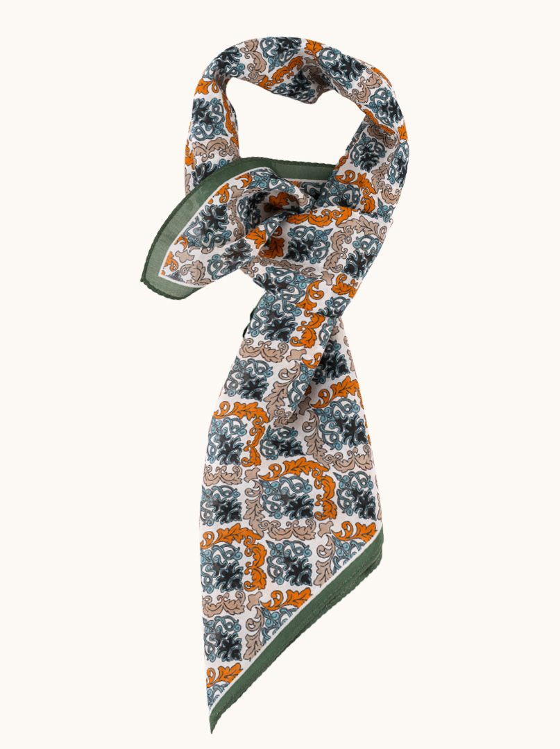 This neckerchief made from a combination of cotton and silk impresses with a subtle decorative pattern inspired by classical ornaments. Harmonious juxtaposition of warm shades of orange, blue and green creates an elegant, yet fresh composition, which attracts attention with delicate detail.Natural blend of cotton and silk makes the material light, airy and pleasant to the touch. The scarf sits softly at the neck, adding subtle elegance and lightness to the styling.