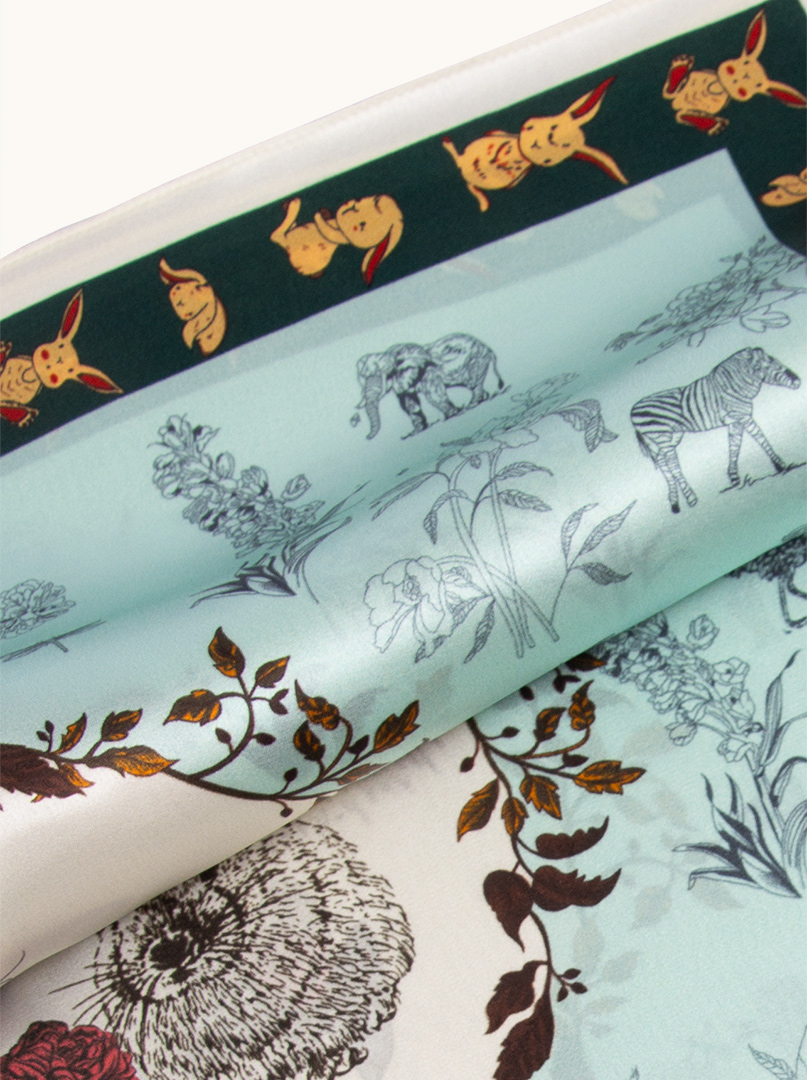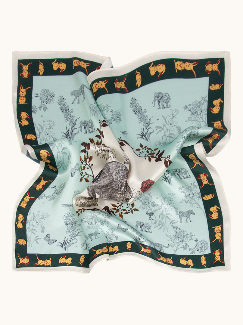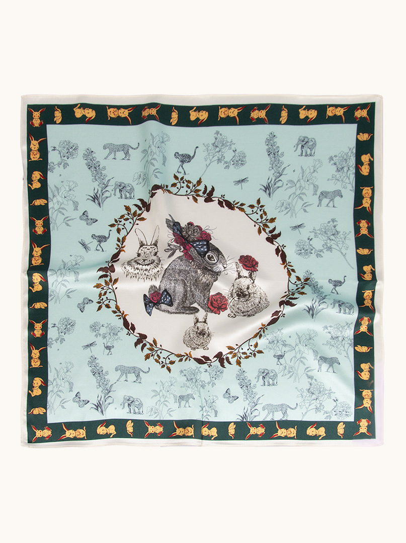 This neckerchief has a charming illustration-style print depicting rabbits surrounded by flowers and plants. The centerpiece features a large gray rabbit adorned with a floral crown, while smaller animal silhouettes surround it. The light blue background is decorated with subtle sketches of plants, while the whole is surrounded by a dark green frame with a motif of golden bunnies.