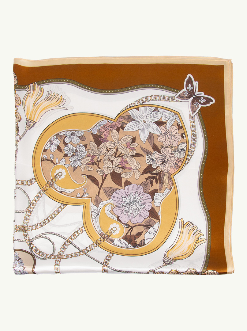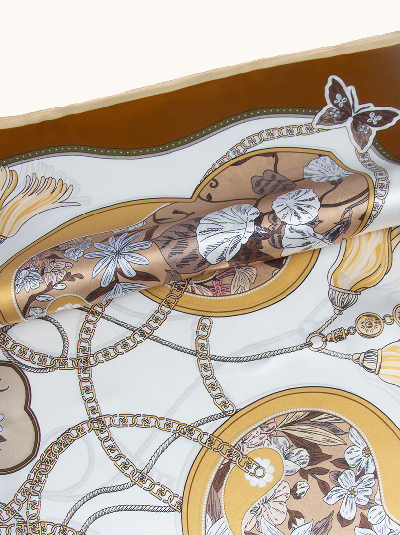 Nasza jedwabna apaszka w odcieniach beżu jest wyjątkowo elegancka i pełna delikatnego uroku. Jej głównym motywem są subtelne kwiatowe wzory, a także finezyjne łańcuszki. Apaszka wykonana z wysokiej jakości jedwabiu jest niezwykle miękka w dotyku i doskonale komponuje się zarówno z eleganckimi, jak i codziennymi stylizacjami, dodając im delikatności i subtelności. Można nosić ją na wiele sposobów - zawiązać na szyi, czy też przewiązać wokół głowy.