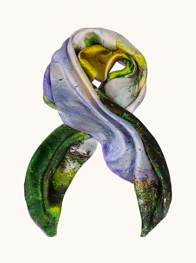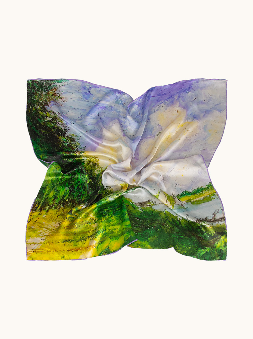 Silk scarf with landscape painting motif 90 cm x 90 cm