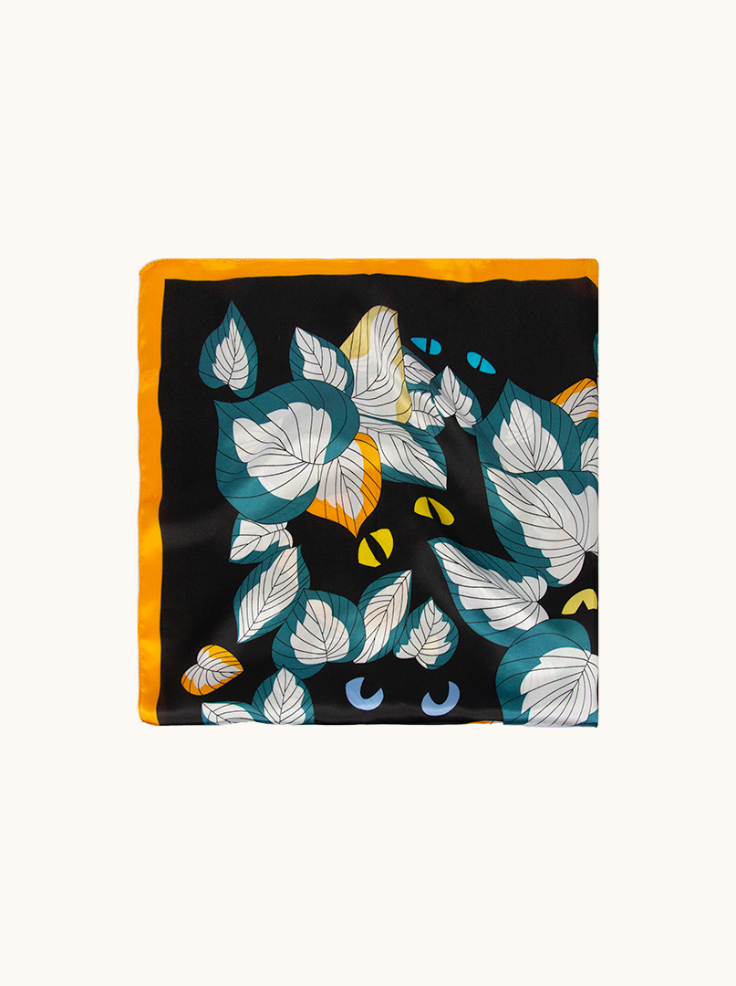 Jedwabna apaszka 90x90 cm w wyrazistej palecie turkusu, czerni i akcentów złota,zdobiona nowoczesnym motywem roślinnym.Elegancka apaszka damska wykonana z 100% jedwabiu,idealna do stylizacji minimalistycznych i nowoczesnych.