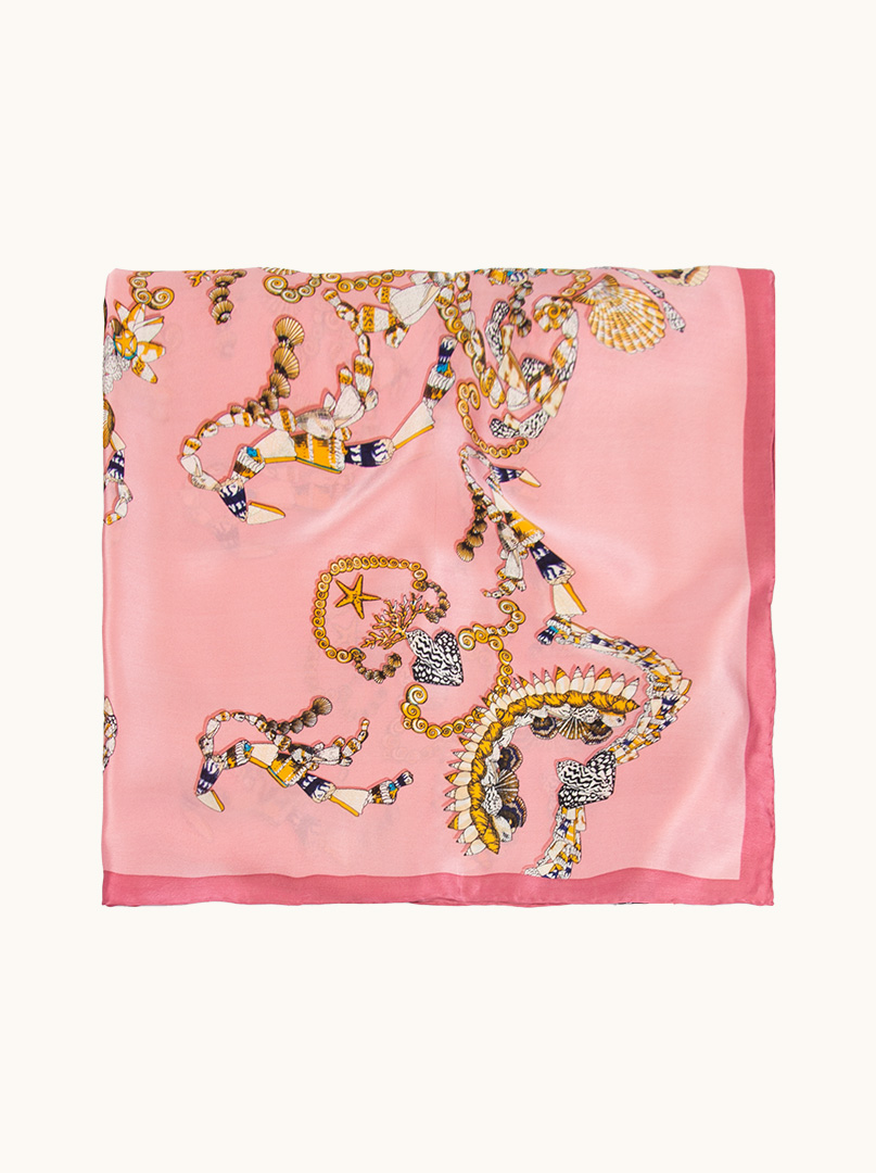 Jedwabna apaszka 90x90 cm w delikatnej palecie różu,zdobiona eleganckim motywem inspirowanym stylem jeździeckim.Elegancka apaszka damska wykonana z 100% jedwabiu,idealna do kobiecych, klasycznych i nowoczesnych stylizacji.