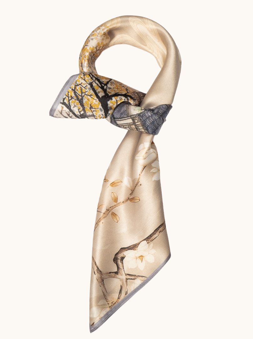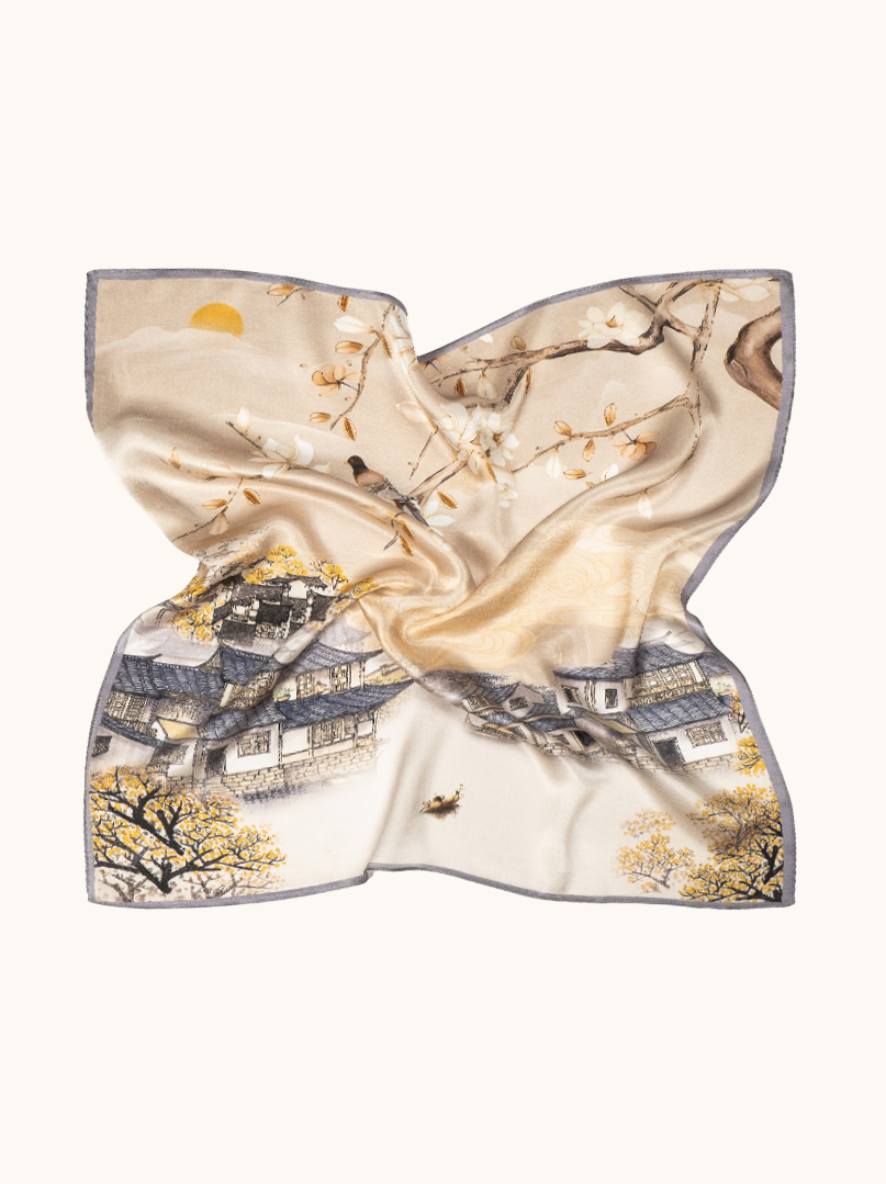 Ta jedwabna apaszka to esencja spokoju i wyrafinowania. Utrzymana w delikatnych, ciepłych odcieniach beżu i złamanej bieli, zachwyca malarskim pejzażem inspirowanym orientalną sztuką. Motyw spokojnej wioski nad wodą, otoczonej kwitnącymi drzewami i miękką mgłą, tworzy harmonijną, niemal medytacyjną kompozycję.