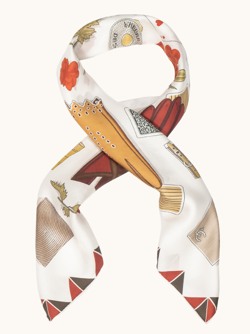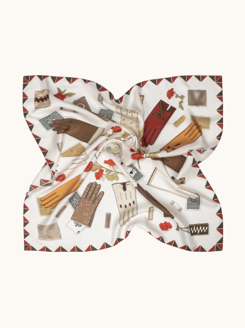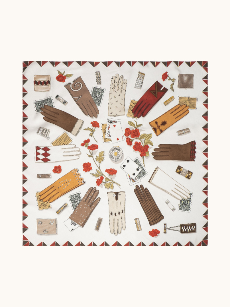 Wyjątkowa z grubego jedwabiu, pełna charakteru apaszka inspirowana światem eleganckich dodatków i kobiecego stylu.Motyw różnorodnych rękawiczek – od klasycznych, skórzanych modeli po bardziej dekoracyjne formy –tworzy nieoczywistą, modową kompozycję, uzupełnioną subtelnymi detalami, takimi jak karty,biżuteria i kwiaty.