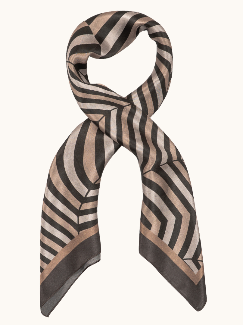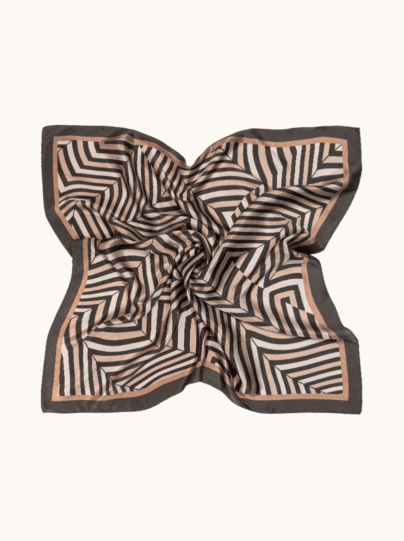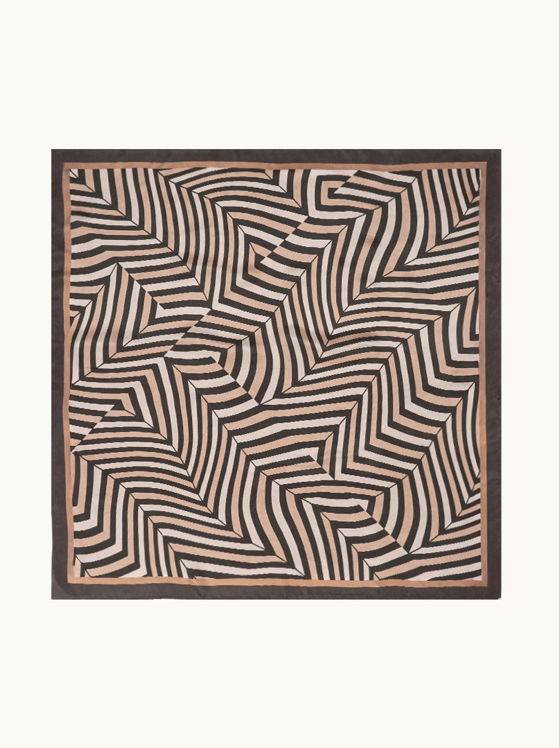 Zygzakowate, falujące linie w odcieniach beżu, czerni i ciepłego karmelu tworzą hipnotyzujący wzór, który przyciąga spojrzenia i dodaje stylizacji charakteru – bez krzyku, za to z klasą.