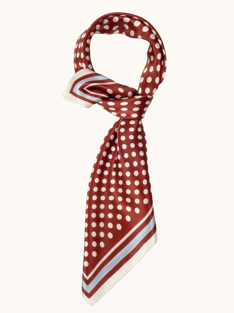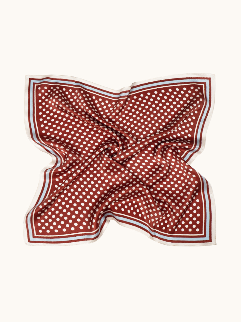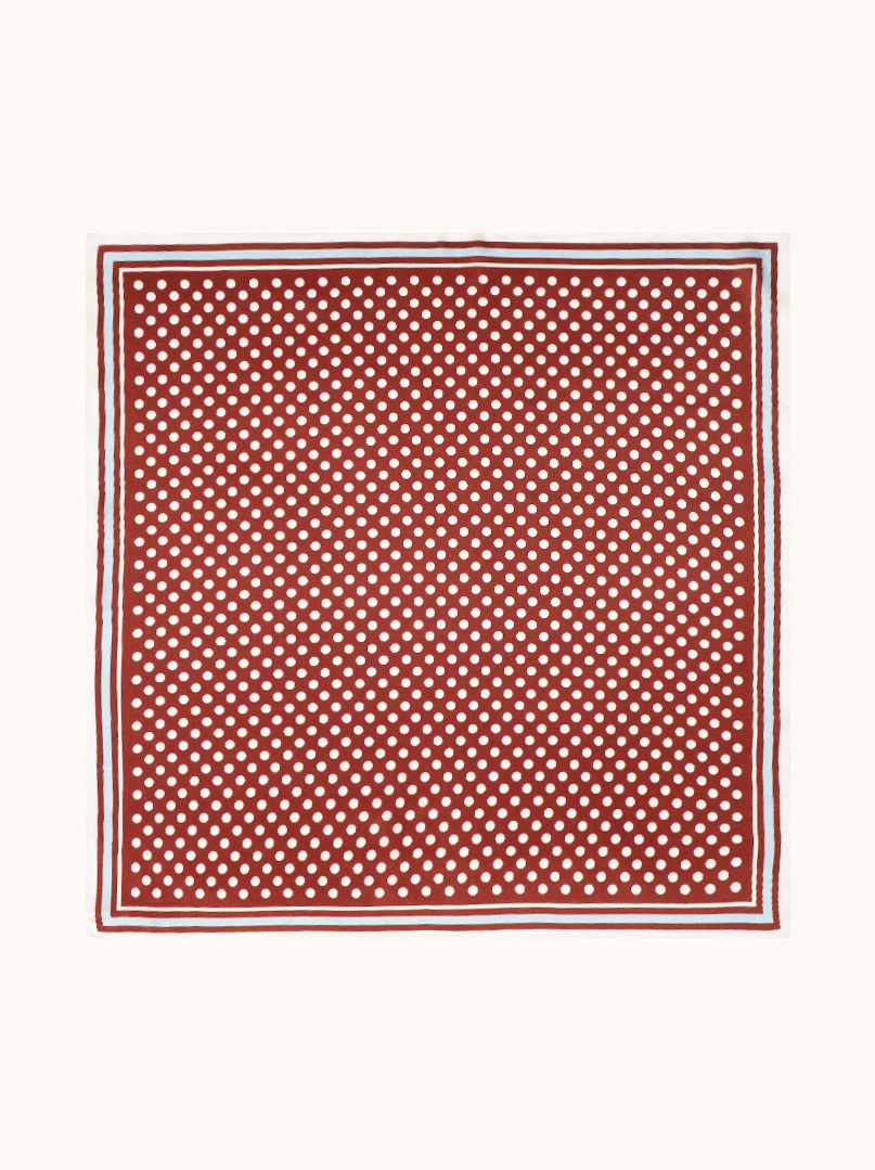 Jedwabna apaszka w klasyczny wzór groszków na tle głębokiej czerwieni to dodatek, który przyciąga uwagę swoją wyrazistością i elegancją. Minimalistyczny, geometryczny print w połączeniu z kontrastową ramką nadaje jej nowoczesny, uporządkowany charakter, idealny do stylizacji smart casual i biznesowych. Lekka, luksusowa tkanina pięknie się układa, podkreślając szyk i świadomy styl kobiety, która lubi klasykę w świeżym wydaniu.