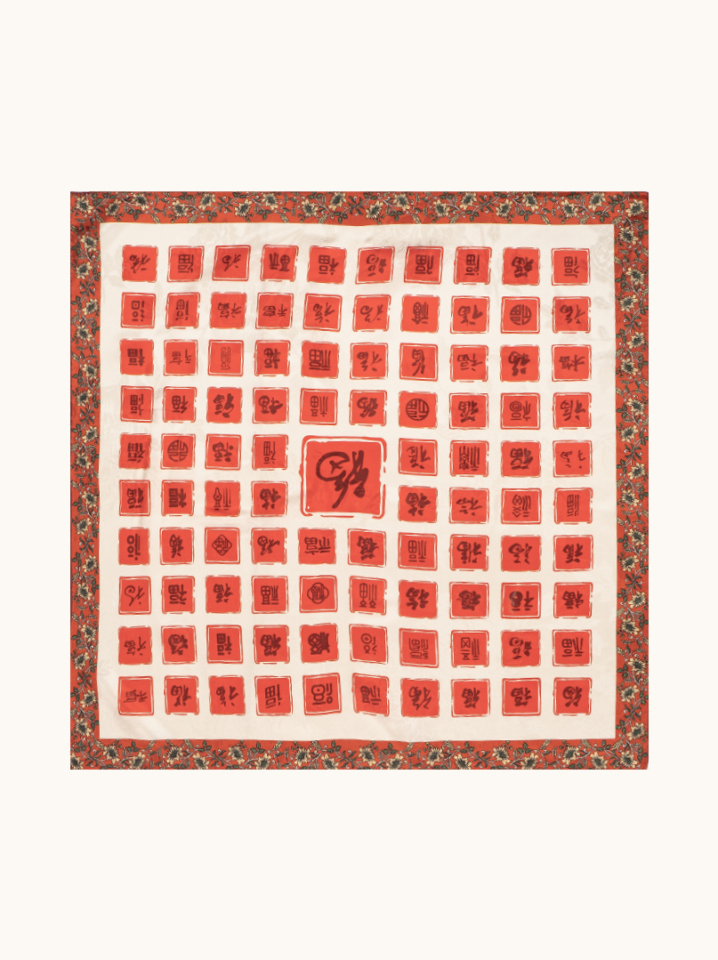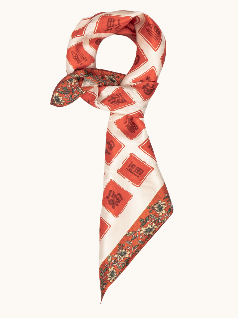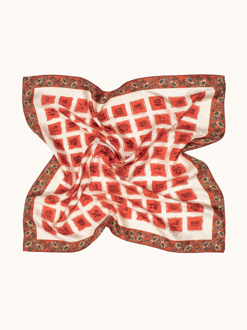 Ta apaszka jedwabna wykonana z grubszego, mięsistego jedwabiu wyróżnia się wyrazistym, orientalnym wzorem inspirowanym chińską kaligrafią i symboliką szczęścia. I