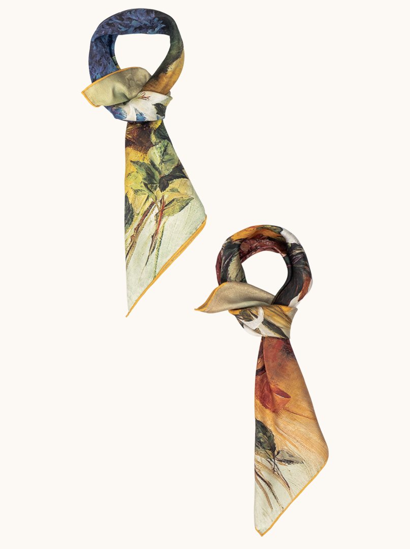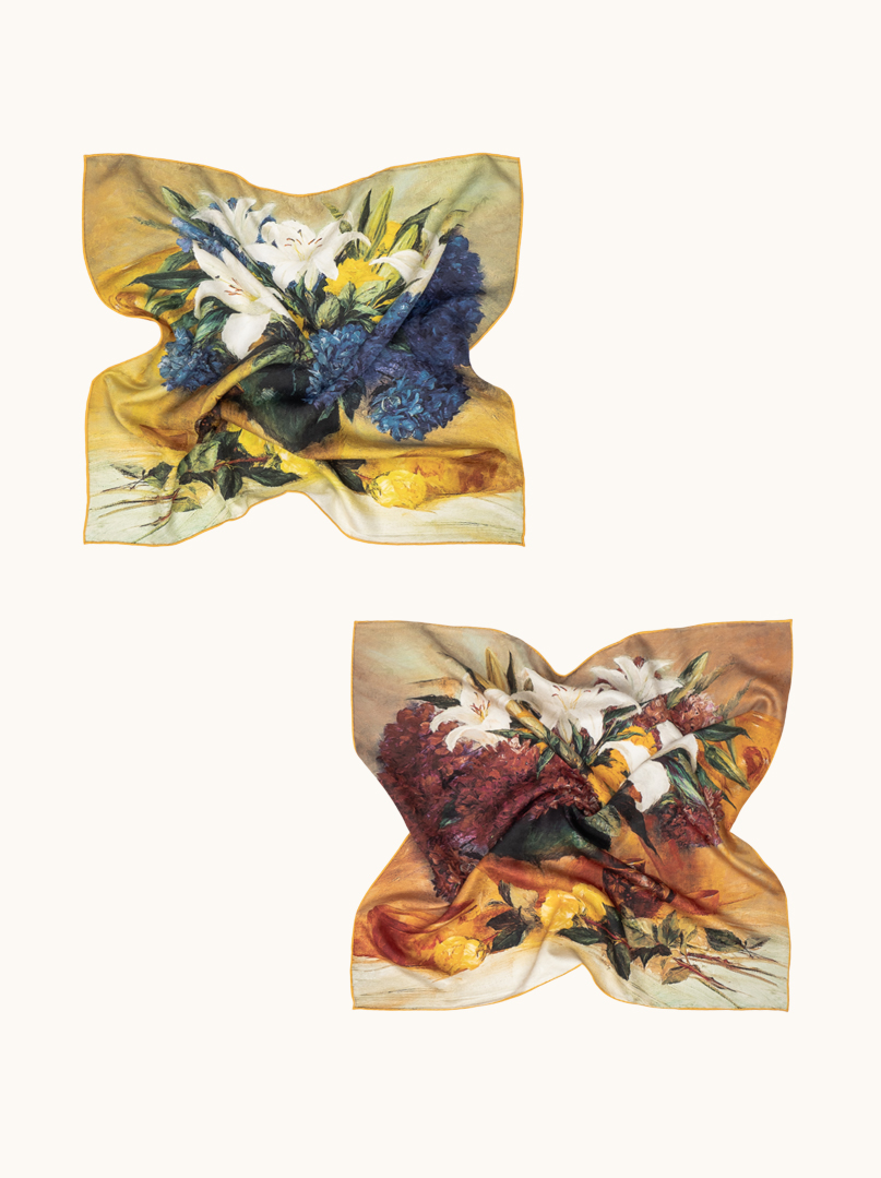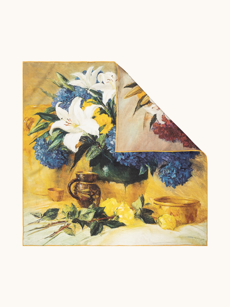 Model zachwyca malarskim motywem kwiatowym inspirowanym klasycznym martwym naturą – widzimy tu subtelne lilie, hortensje oraz ciepłe akcenty owoców i ceramiki, zanurzone w złocisto-miodowej tonacji. Druga strona apaszki utrzymana jest w głębszej, bardziej nasyconej palecie z nutami bordo i ciepłego bursztynu, co daje efekt dwóch zupełnie różnych stylizacji w jednym produkcie.