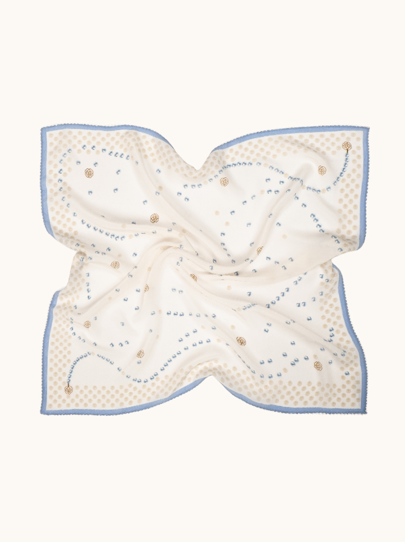 Noś ją do jasnej marynarki lub lnianej koszuli, wiążąc luźno przy szyi, aby podkreślić jej lekkość i subtelny wzór. Świetnie wygląda też przewiązana przy torebce, dodając stylizacji eleganckiego, dopracowanego detalu.