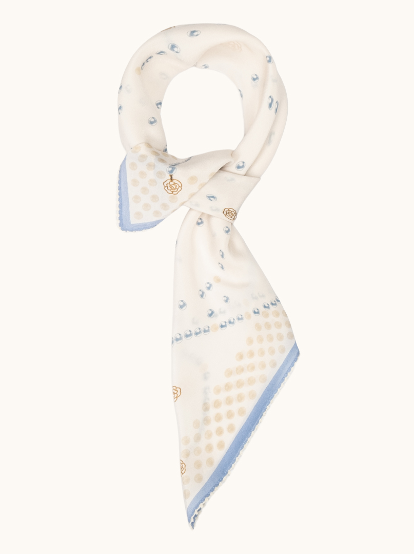 Jasna, świetlista kolorystyka z drobnym motywem kwiatowym pięknie rozświetla stylizację i dodaje jej miękkości. To idealny dodatek dla kobiet, które cenią dyskretny luksus i ponadczasową kobiecość.