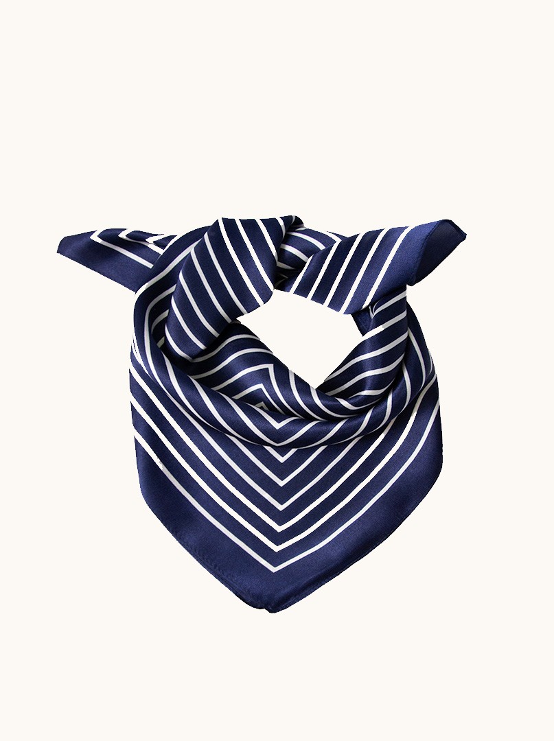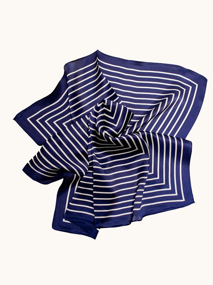 Klasyka w nowoczesnym wydaniu. Ta jedwabna apaszka w granatowo-białe paski to idealne połączenie elegancji i graficznej wyrazistości. Geometryczny układ linii tworzy efekt głębi i przyciąga spojrzenia, jednocześnie pozostając w duchu ponadczasowego stylu.