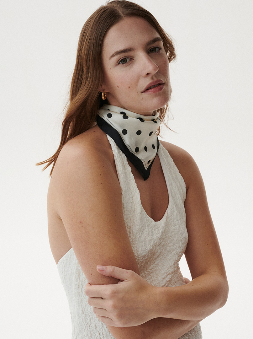 Kremowa apaszka z ponadczasowym wzorem groszków.