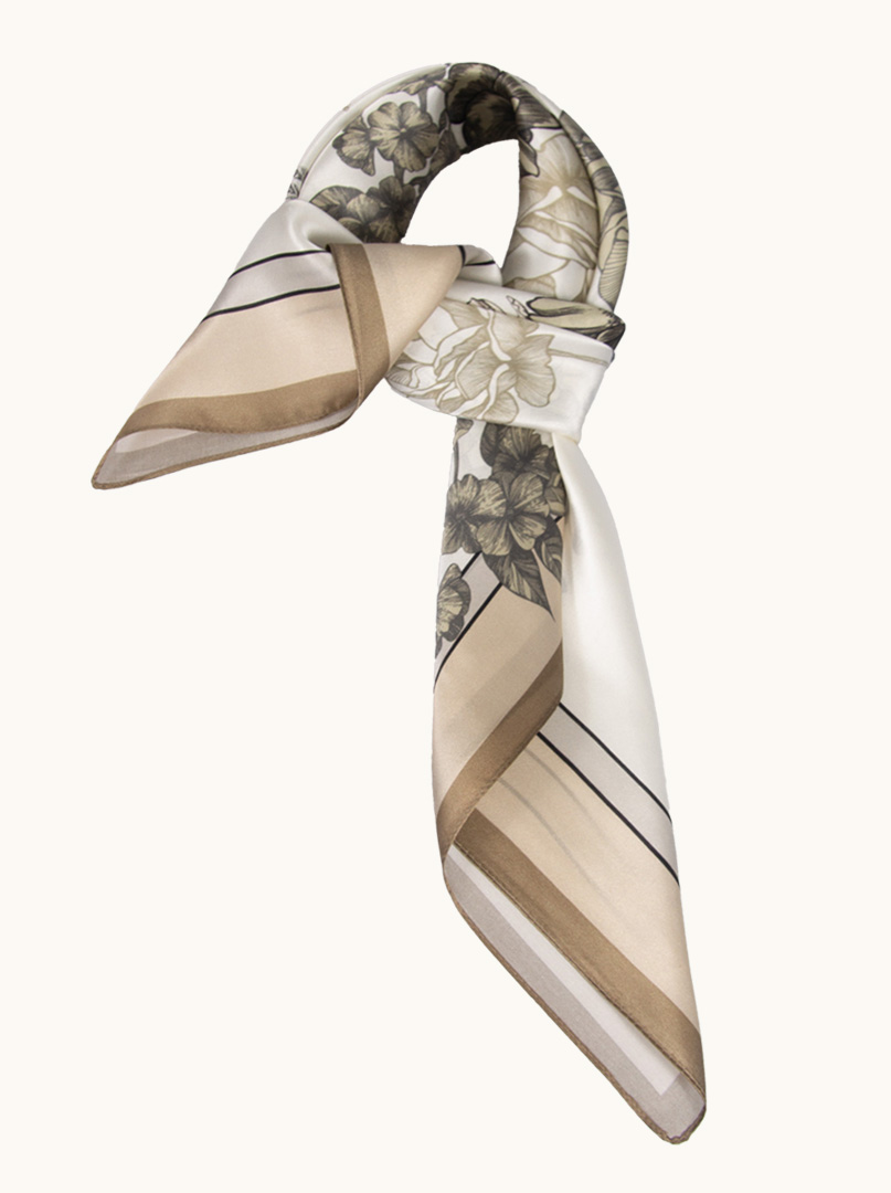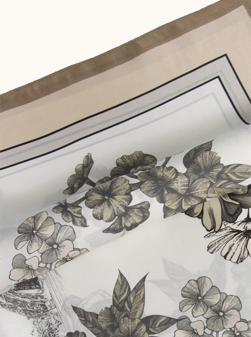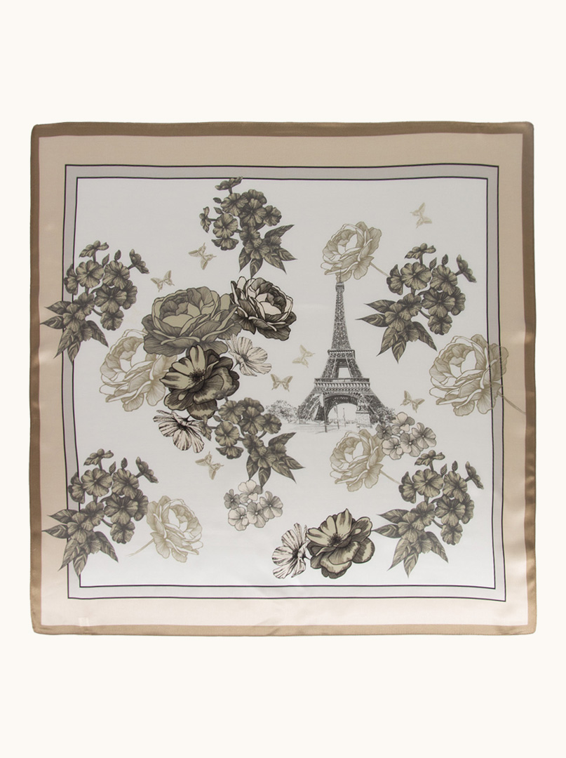 Ta kremowa apaszka z oliwkowo-beżową obwódką jest subtelna i elegancka. Dominujący na niej kwiatowy wzór w oliwkowych tonacjach, dodaje delikatności i świeżości, a symbol Wieży Eiffla jest wyrazem francuskiego uroku i romantyzmu. Kremowy kolor tła pozwala na łatwe dopasowanie do różnych stylizacji. To elegancki dodatek, dzięki któremu każda stylizacja będzie wyglądała bardziej efektownie i stylowo.