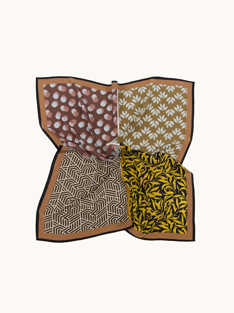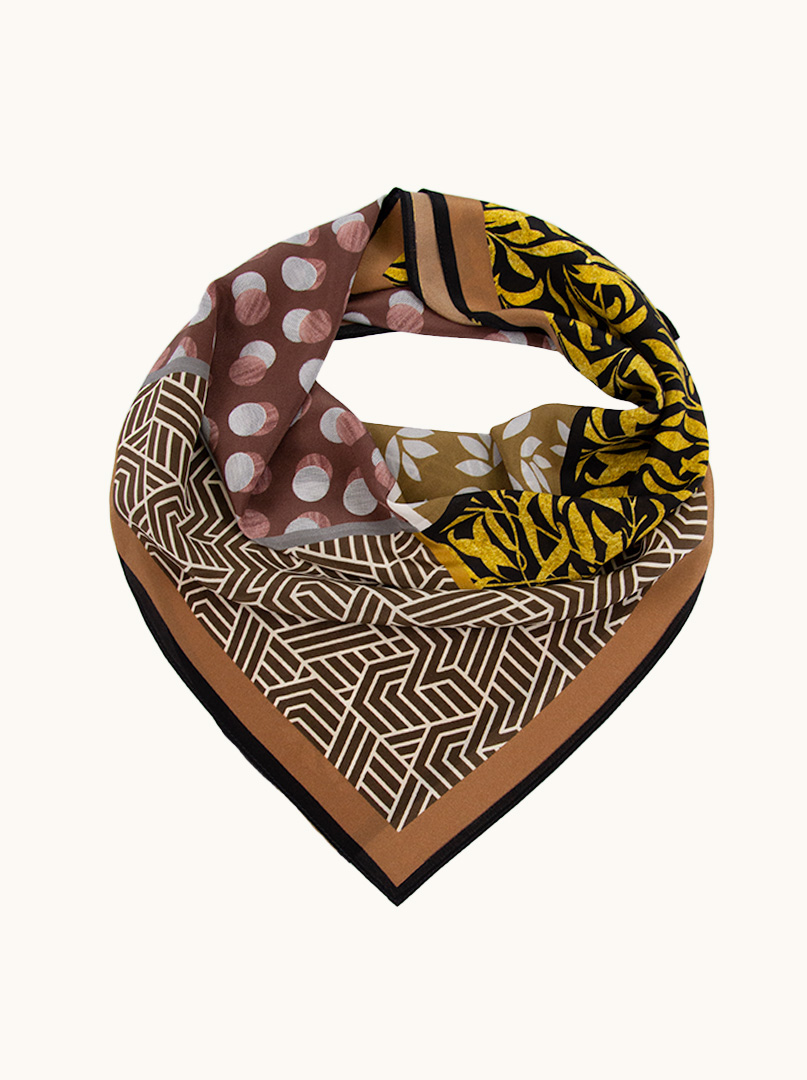 Ciepła paleta kolorów – od karmelowego brązu, przez złote odcienie, aż po głęboką czerń – nadaje apaszce wyrafinowanego charakteru.Kontrastujące wzory sprawiają, że dodatek wygląda niezwykle stylowo i nowocześnie, jednocześnie pozostając bardzo elegancki.