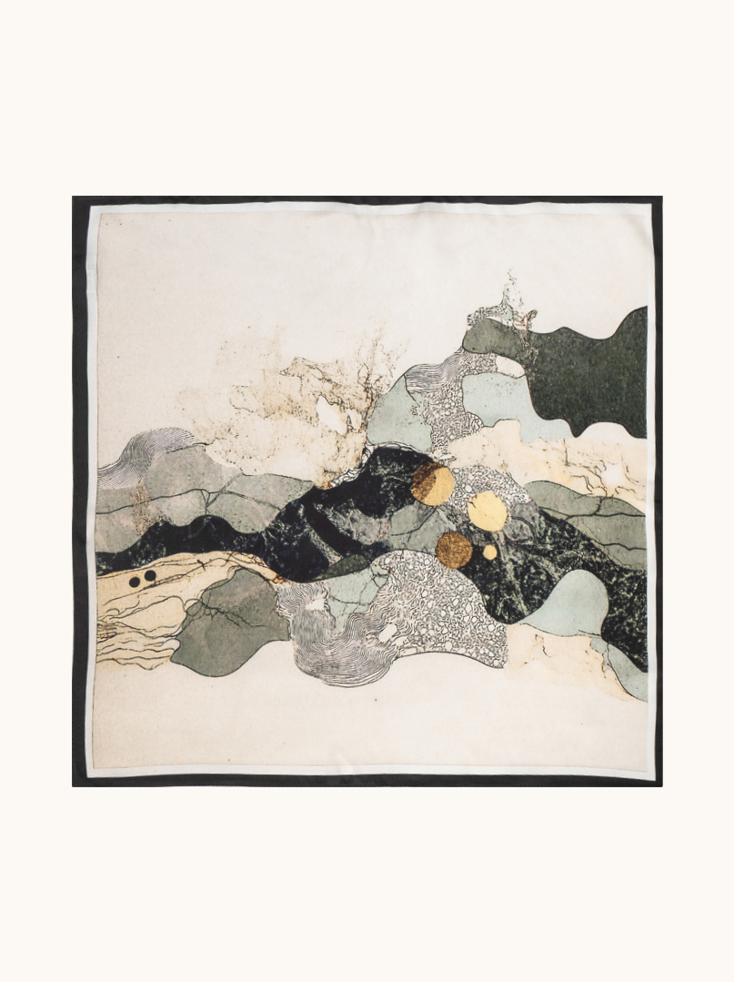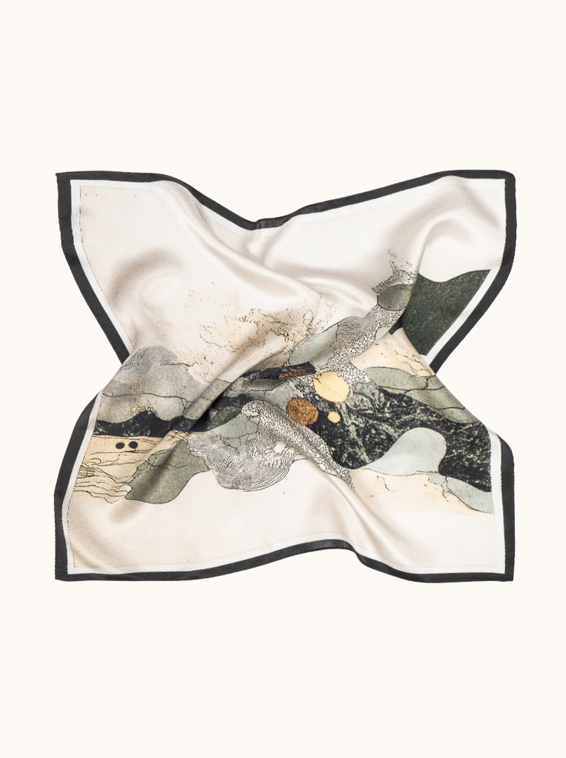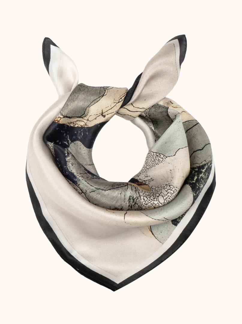 Sztuka, którą nosisz. Ta jedwabna apaszka zachwyca nowoczesnym, abstrakcyjnym wzorem inspirowanym naturą i strukturami organicznymi. Stonowana paleta beży, zieleni i czerni została przełamana subtelnymi, złotymi akcentami, które dodają całości eleganckiego charakteru.