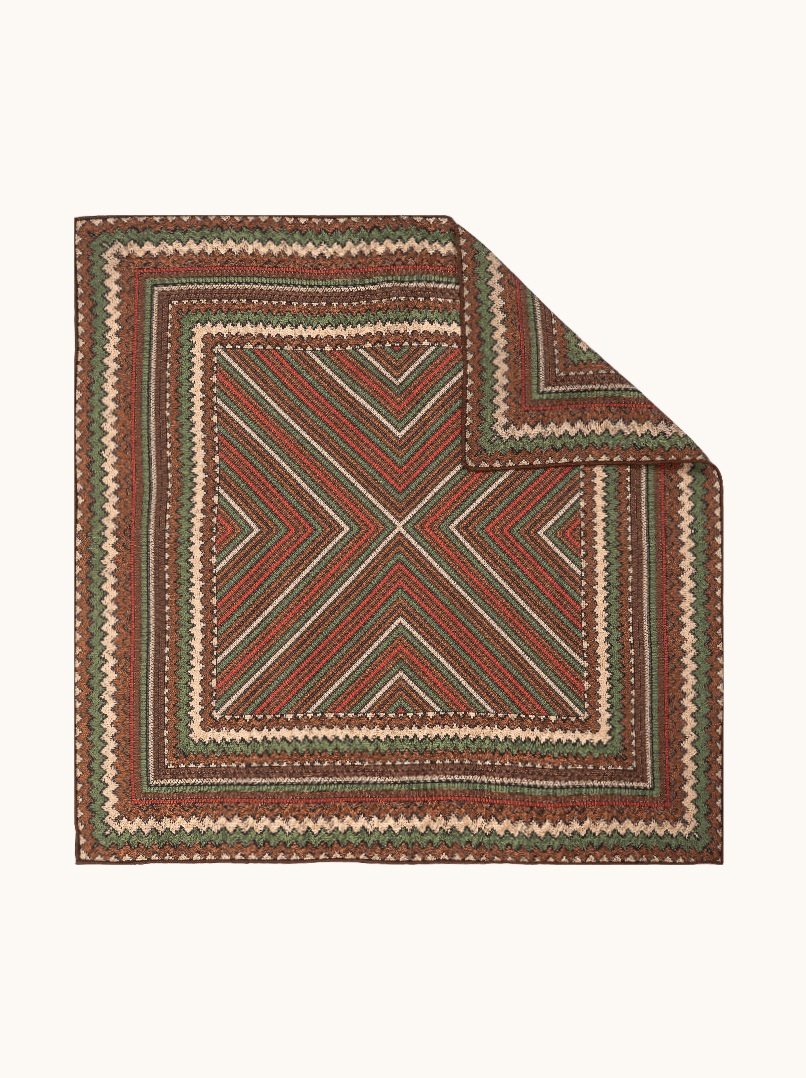 Ta apaszka wykonana z mieszanki wełny i jedwabiu łączy w sobie miękkość, lekkość i komfort noszenia z eleganckim wyglądem. Etniczno-geometryczny wzór inspirowany tradycyjnymi motywami tworzy wyrazistą, ale harmonijną kompozycję.