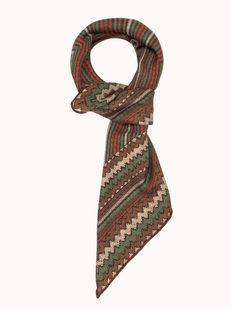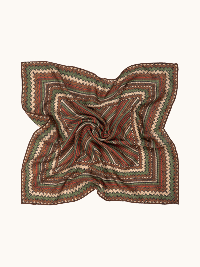 Paleta ciepłych brązów, rudości, oliwkowej zieleni i beżu nadaje apaszce ponadczasowy charakter i sprawia, że doskonale komponuje się z jesienno-zimową garderobą, ale równie dobrze odnajdzie się w stylizacjach przez cały rok.