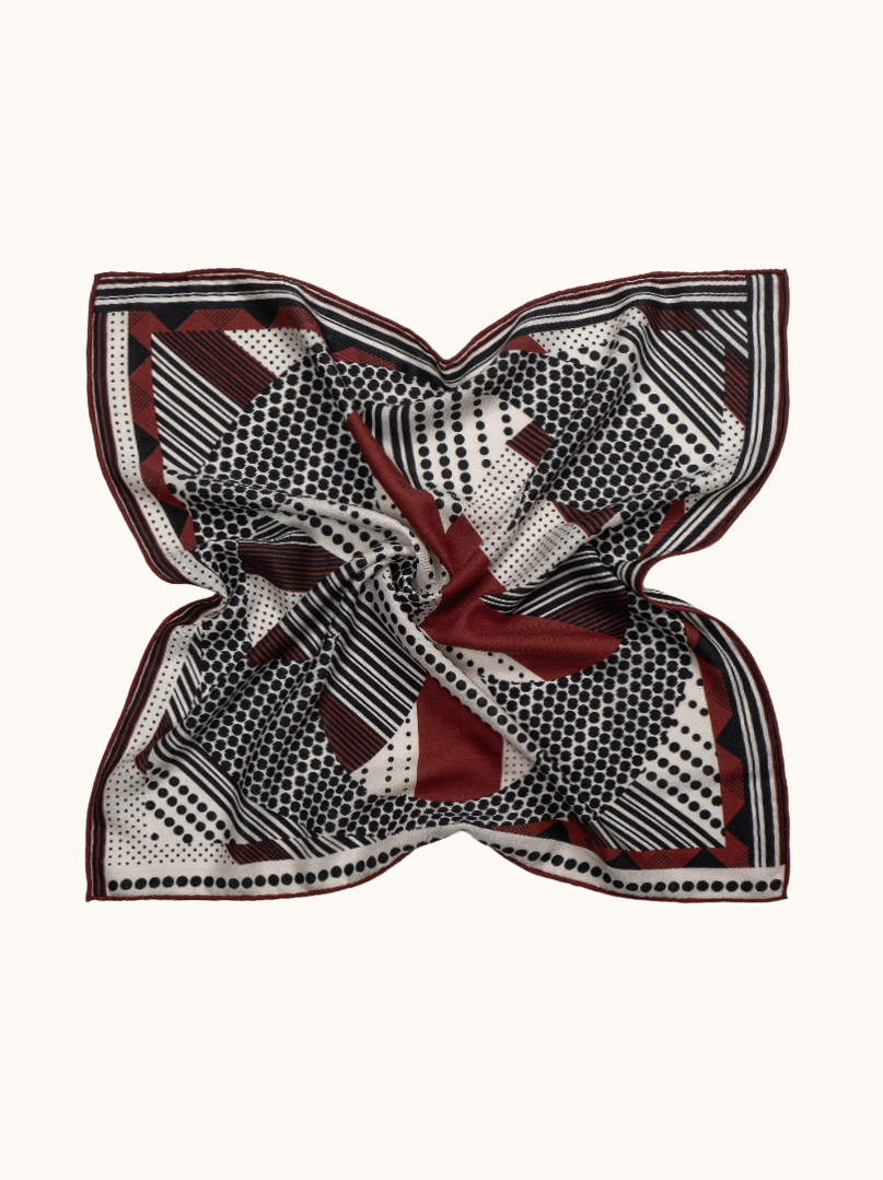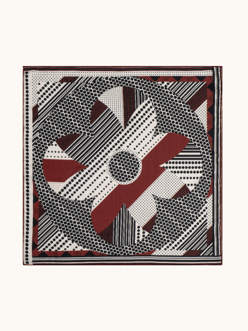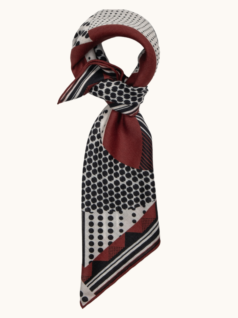 Nowoczesna apaszka z wełny i jedwabiu, która natychmiast podnosi poziom każdej stylizacji. Graficzny, geometryczny wzór w czerni i kremie został przełamany głębokim burgundem, tworząc elegancką, wyrazistą kompozycję z charakterem.