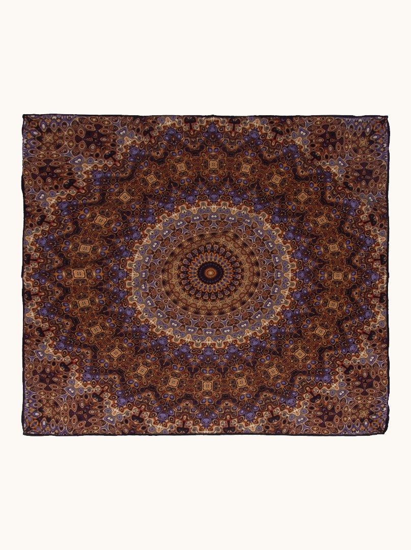 Wyrazisty, geometryczny wzór inspirowany motywem mandali przyciąga wzrok hipnotyczną symetrią i głębią kolorów. Dominują odcienie butelkowej zieleni, karmelu, ciepłego brązu i granatu, które tworzą szlachetną, wielowymiarową kompozycję.