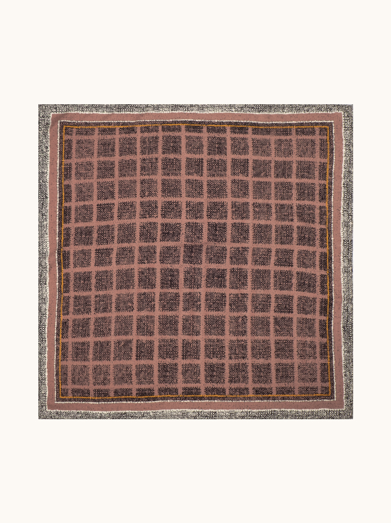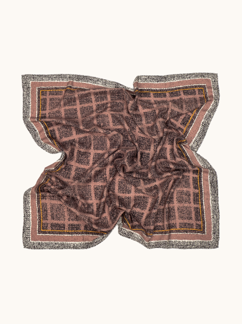 Stylowa apaszka o wymiarach 90x90 cm wykonana z wysokiej jakości wełny australijskiej to ponadczasowy dodatekdla miłośników klasyki. Wzór w subtelną kratę w odcieniach brązu, beżu i przygaszonego różu nadaje jej elegancki,a jednocześnie uniwersalny charakter. Delikatne obramowanie podkreśla całość i dodaje wyrafinowania.