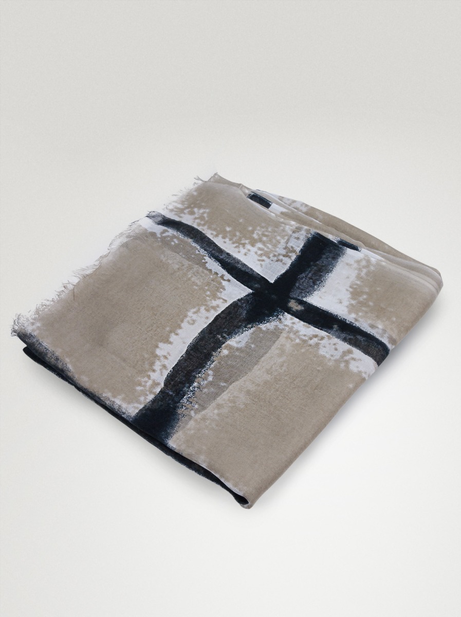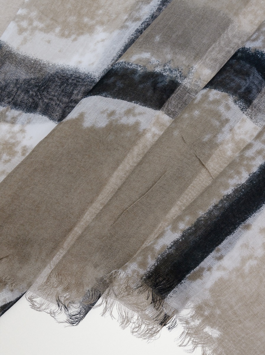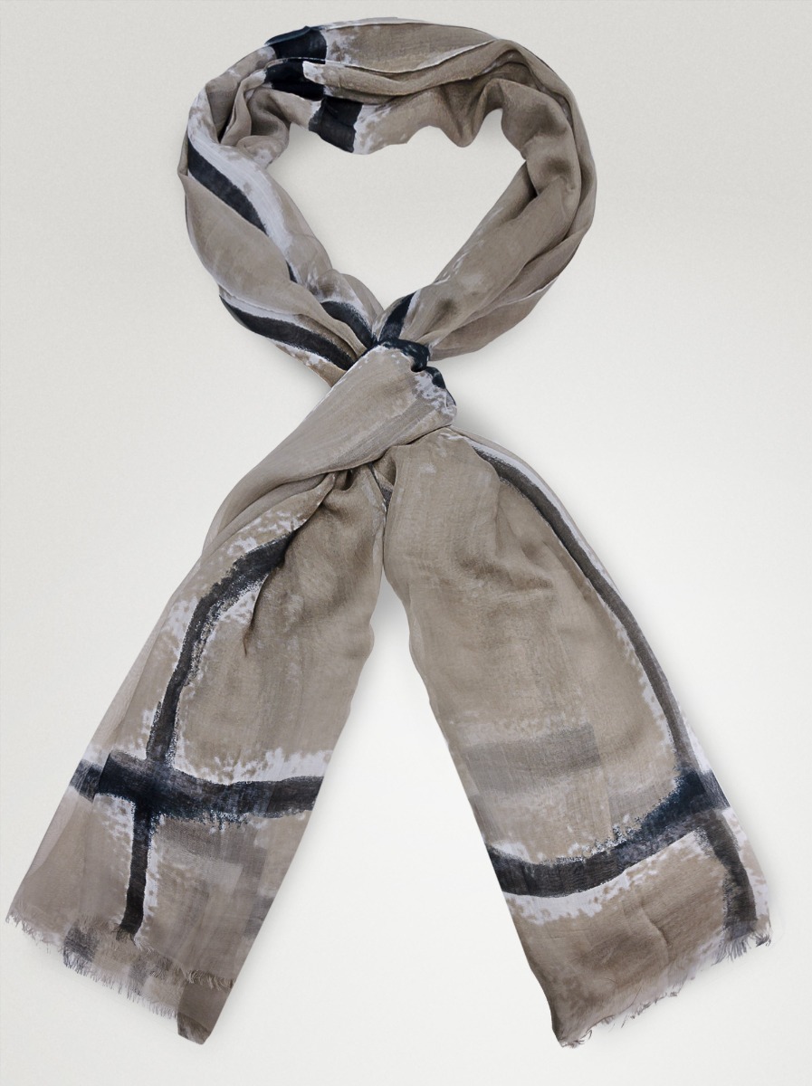 Duży i delikatny szal w kolorze beżowym z motywem dużej kraty. Szal transparentny wykończony małymi frędzlami. Idealnie sprawdzi się do codziennym kreacji.