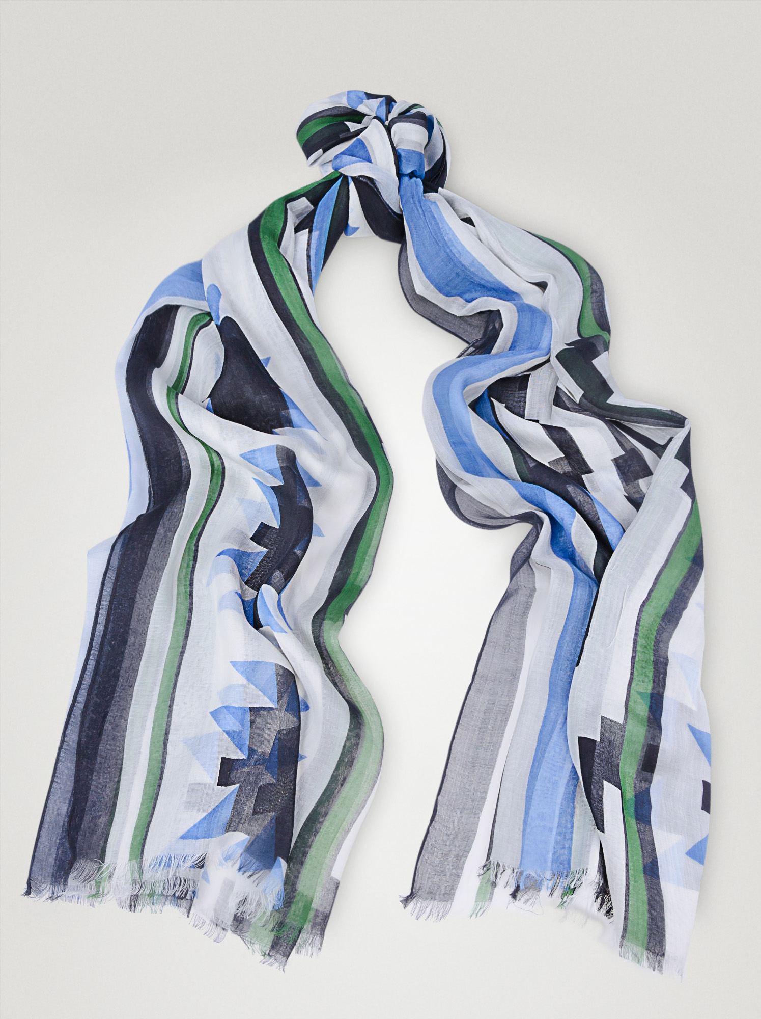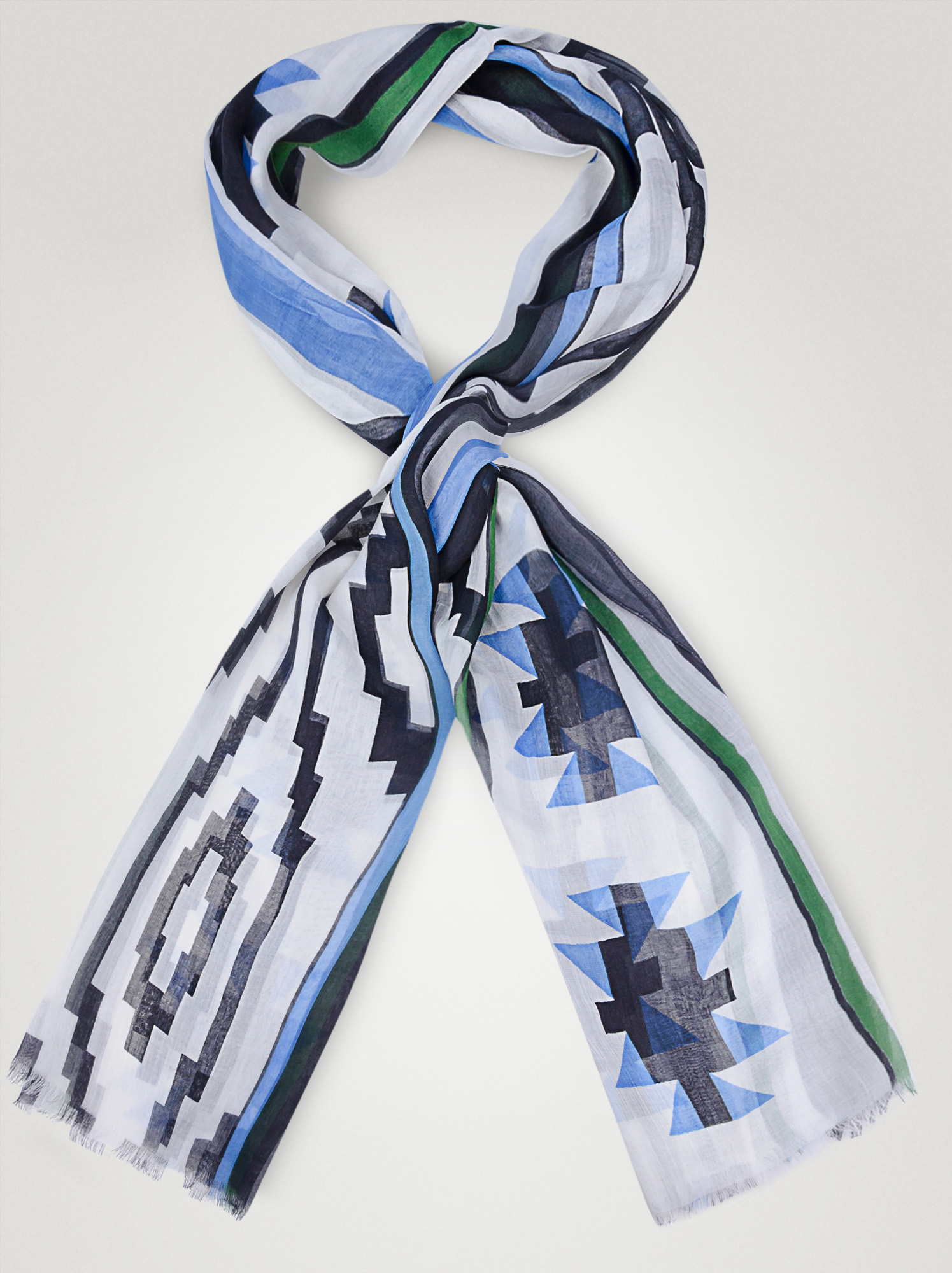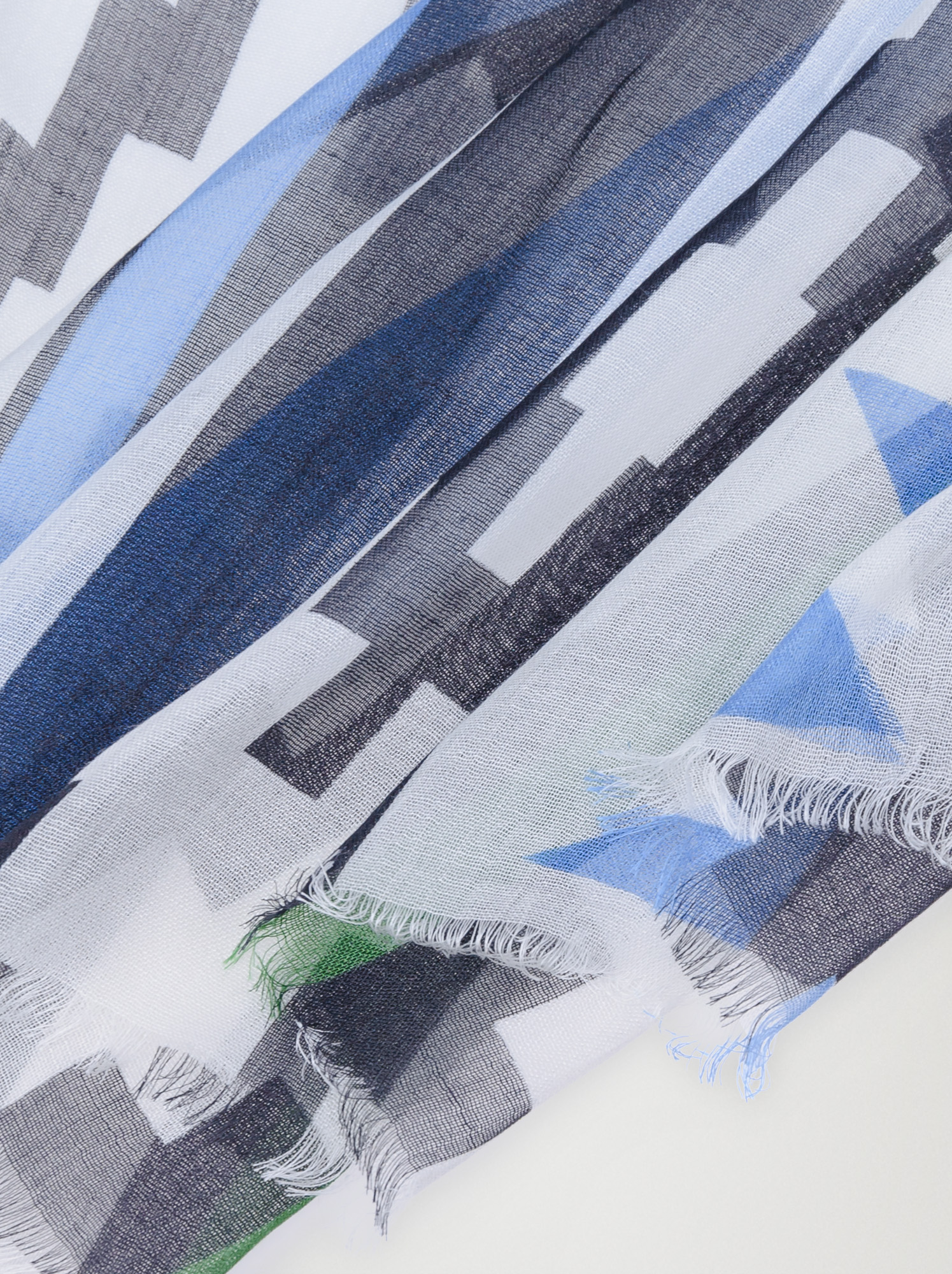 Duży i delikatny szal w kolorze białym ze wzorem geometrycznym. Szal transparentny wykończony małymi frędzlami oraz czarną lamówką. Idealnie sprawdzi się do codziennym kreacji. Wymiary: szerokość - 120 cm, długość - 200 cm