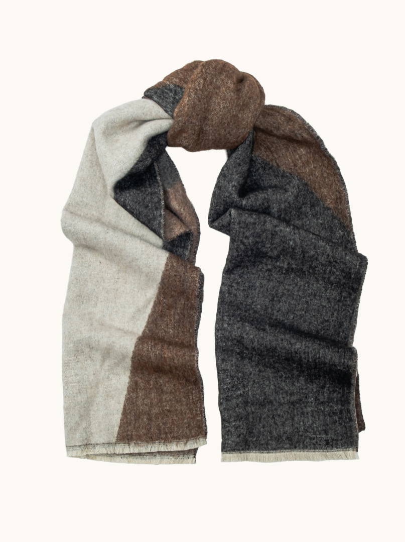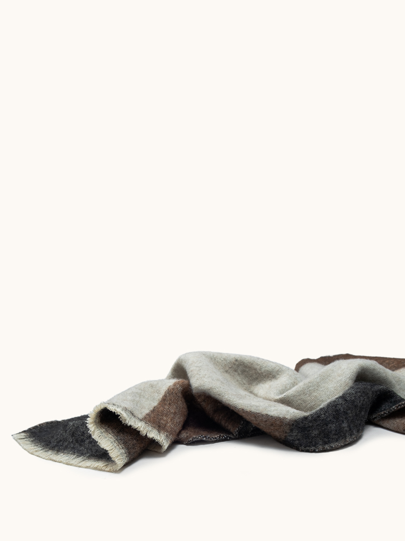 Ciepły szal dwustronny z wełną w odcieniach brązu w geometryczne wzory z delikatnymi frędzlami 50x210 cm