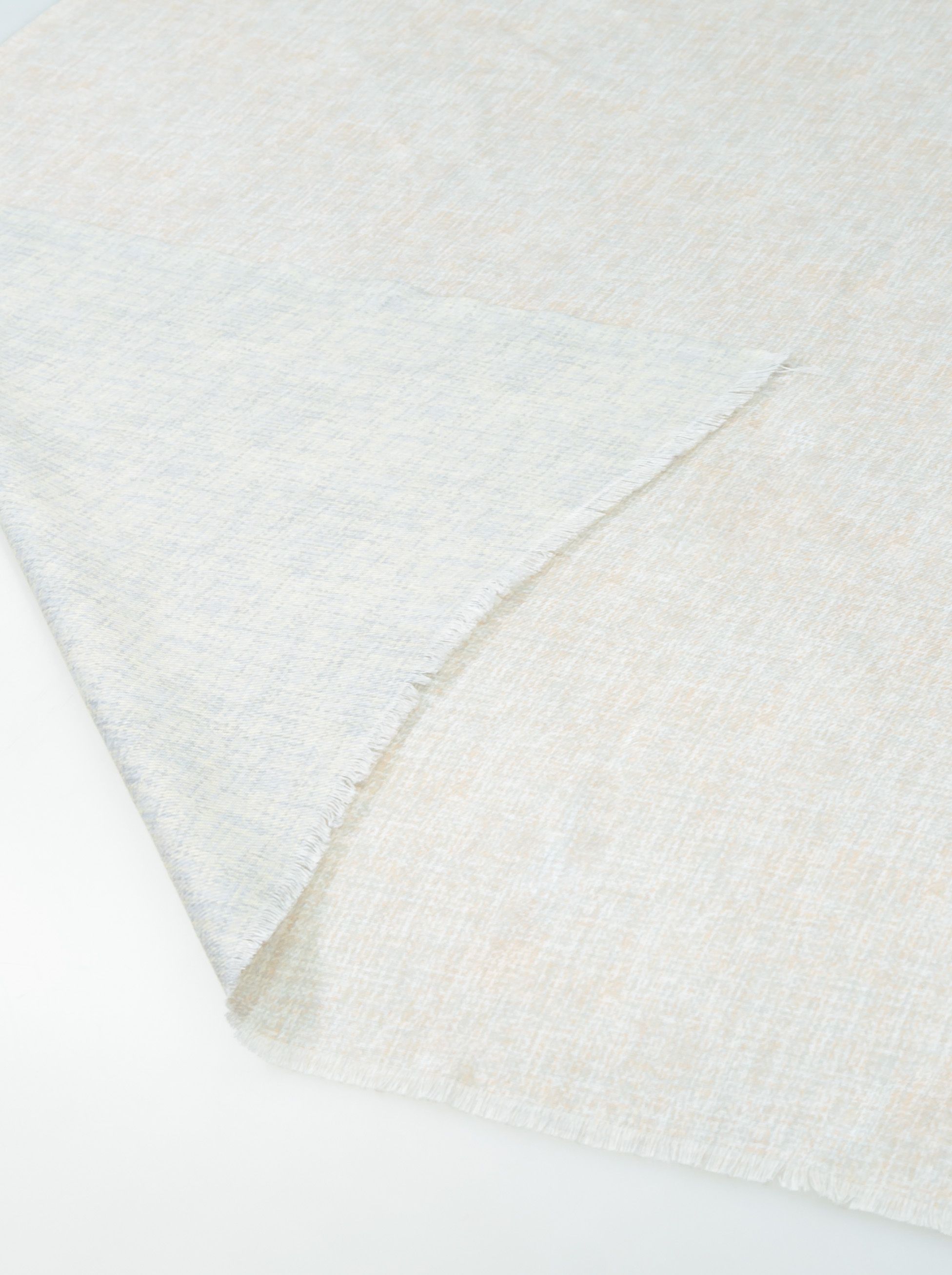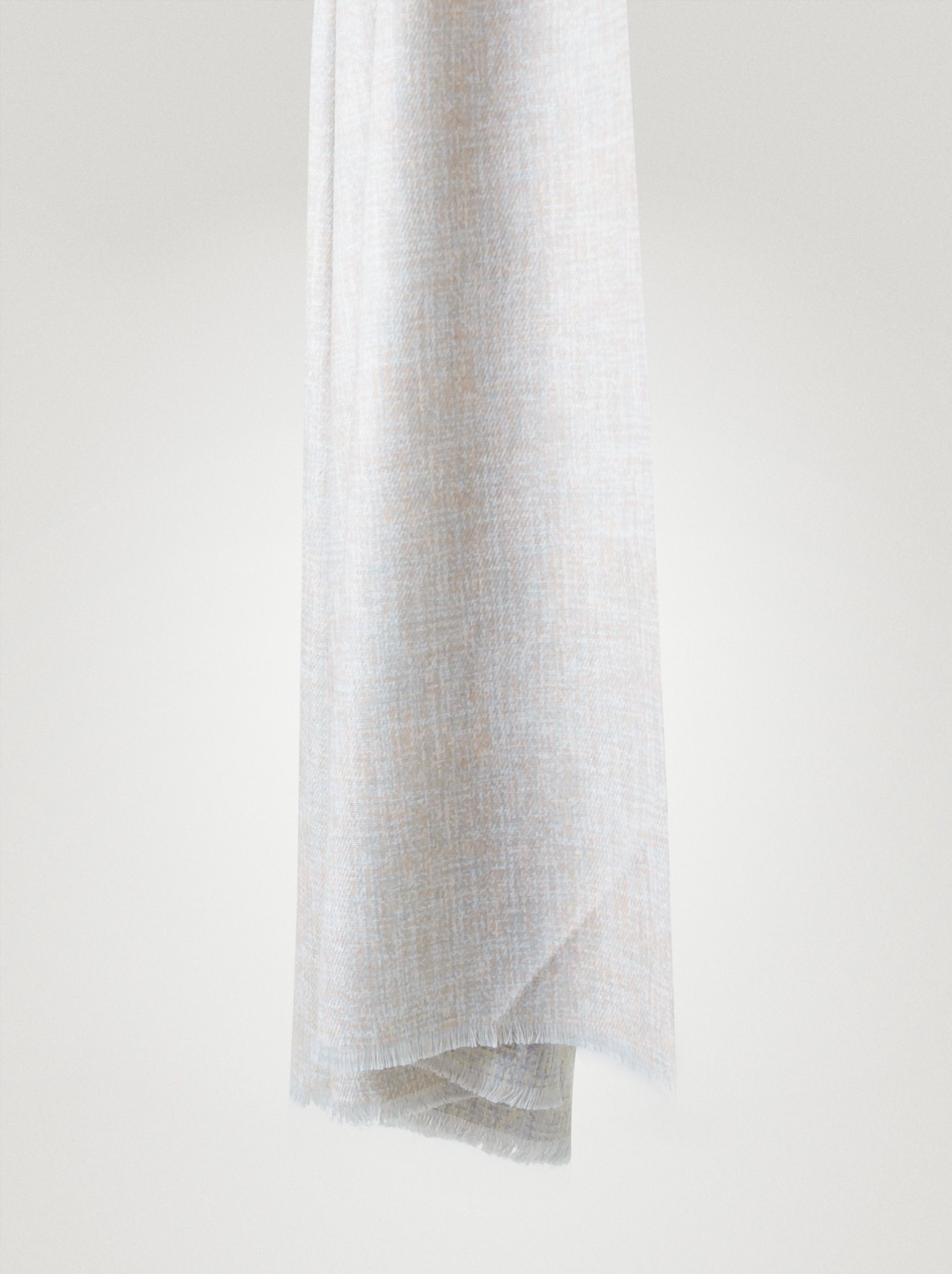 Ciepły i miękki szal w kolorze jasnobeżowym z motywem delikatnego wzoru. Wykończony małymi frędzlami. Idealnie sprawdzi się jako szal przejściowy. Wymiary: szerokość - 70 cm, długość - 180 cm.