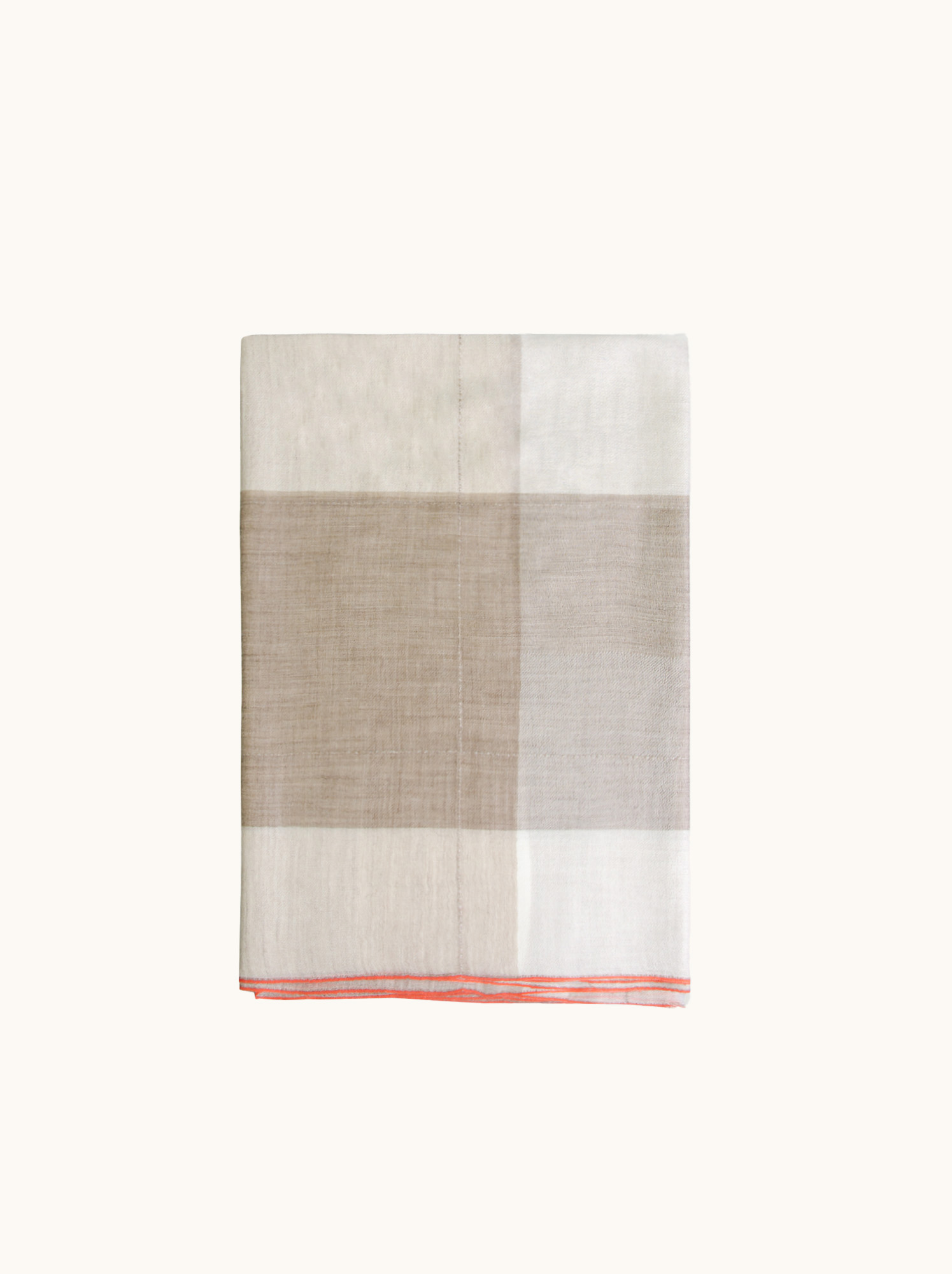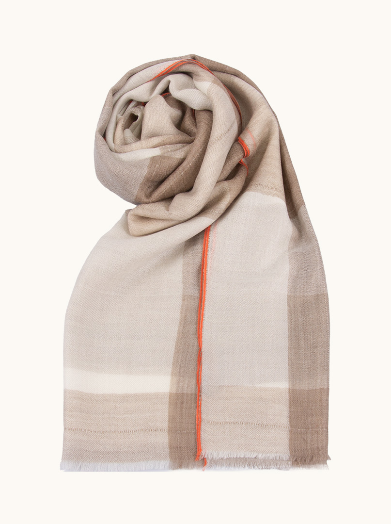 Elegancki kaszmirowy szal w subtelną beżową kratę, wzbogacony o delikatny kontrastowy detal, który nadaje mu nowoczesnego charakteru. To harmonijne połączenie klasycznego wzoru i współczesnego minimalizmu.