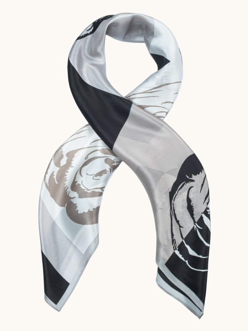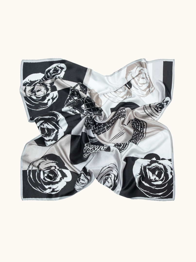 Elegancka jedwabna apaszka damska w klasycznej czarno-białej kolorystyce, z wyrazistym, graficznym wzorem róż i modowych akcentów. Kontrastowe zestawienie czerni, bieli i odcieni szarości nadaje apaszce nowoczesny, artystyczny charakter inspirowany paryskim stylem i światem mody.