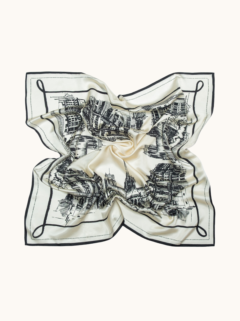 Elegancka jedwabna apaszka damska z artystycznym motywem architektonicznym inspirowanym europejskimi miastami. Graficzny rysunek budynków i zabytków, utrzymany w czarno-białej kolorystyce, tworzy wyjątkową, ilustracyjną kompozycję o nowoczesnym, intelektualnym charakterze.