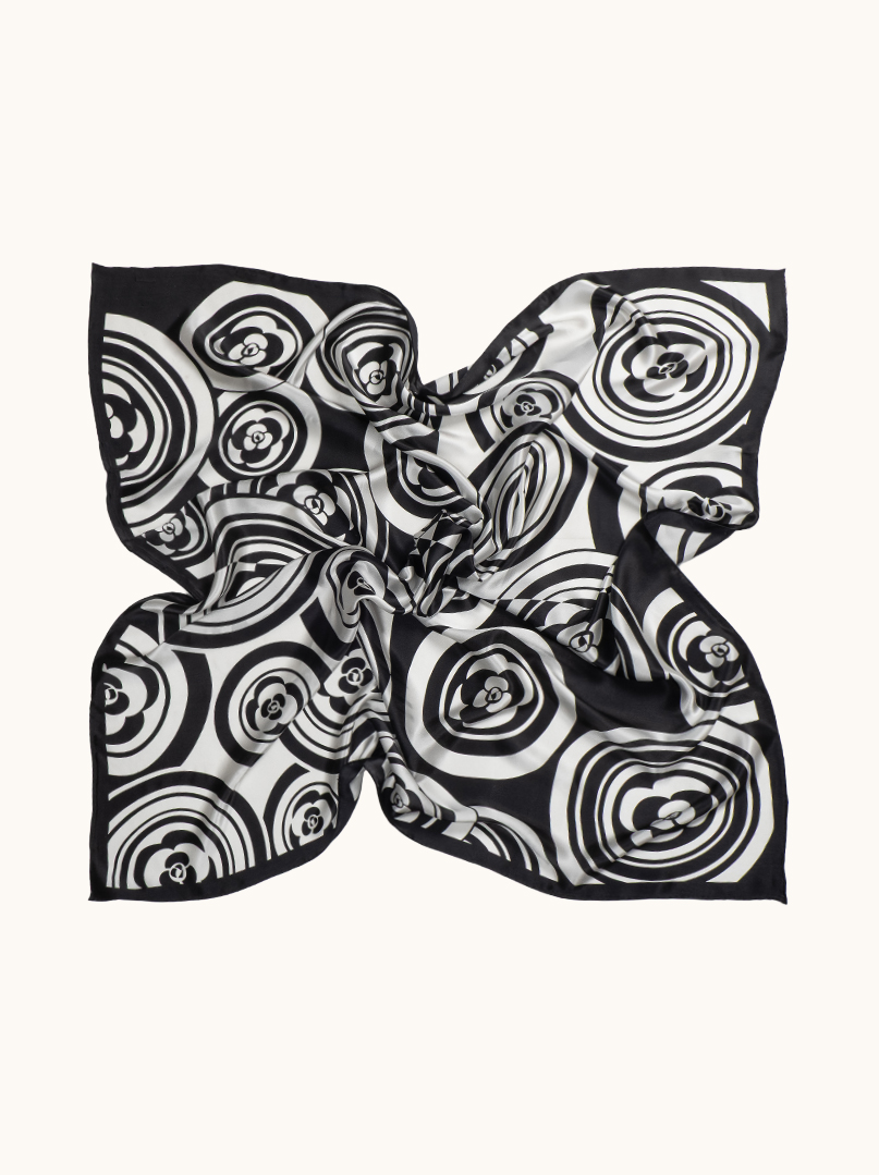 Wyrazista, graficzna i absolutnie ponadczasowa. Ta chusta z naturalnego jedwabiu przyciąga uwagę od pierwszego spojrzenia. Kontrastowa kompozycja czerni i bieli, oparta na rytmicznych okręgach i stylizowanych motywach kwiatowych, tworzy efekt nowoczesnej elegancji z nutą artystycznego pazura.