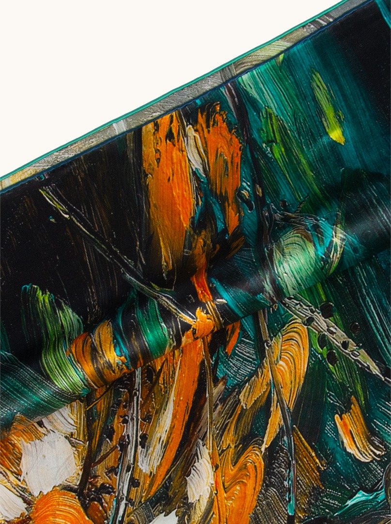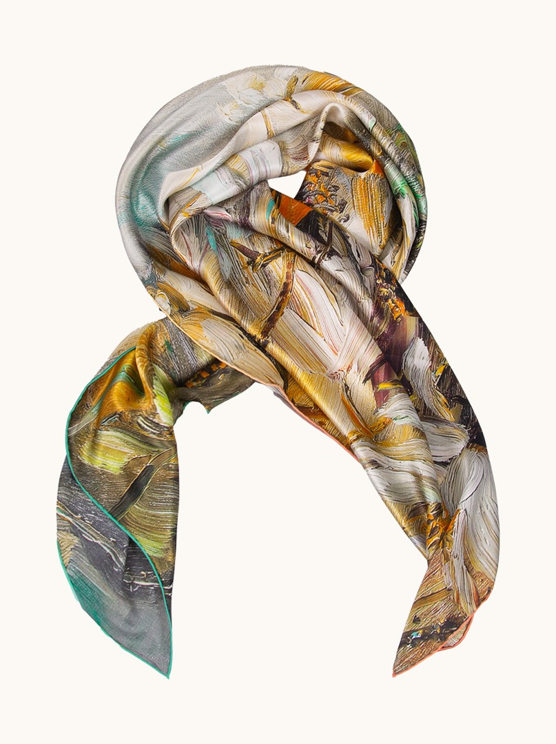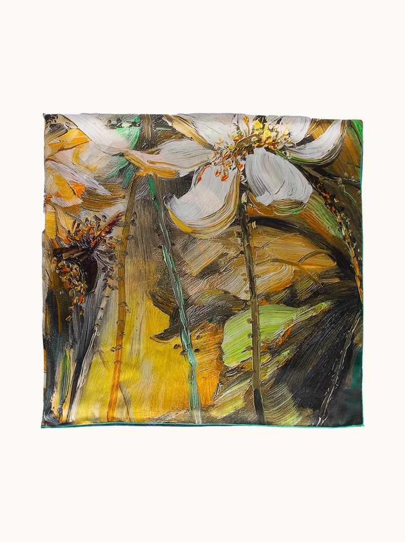 Duża chusta jedwabna ręcznie obszywanna przypomina malarskie dzieło sztuki, z pięknie odwzorowanymi kwiatami w intensywnych kolorach. Motywy kwiatowe są wyrafinowane i eleganckie, nadając chuście artystycznego i luksusowego charakteru. Kolory mogą obejmować zarówno jasne, żywe barwy, jak i bardziej stonowane odcienie, co sprawia, że chusta jest uniwersalna i łatwo dopasowuje się do różnych stylizacji.