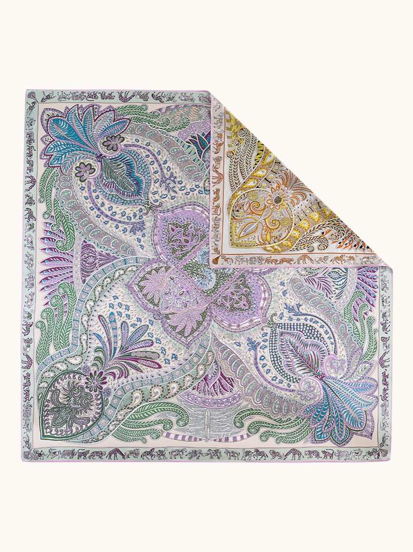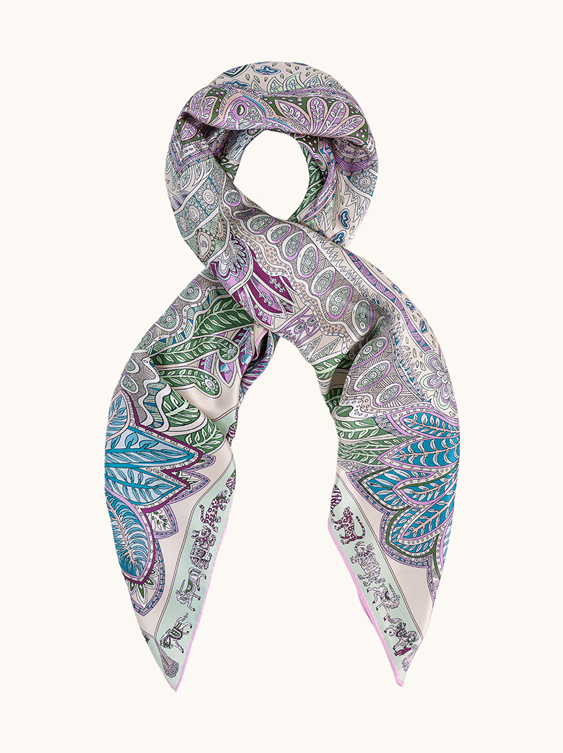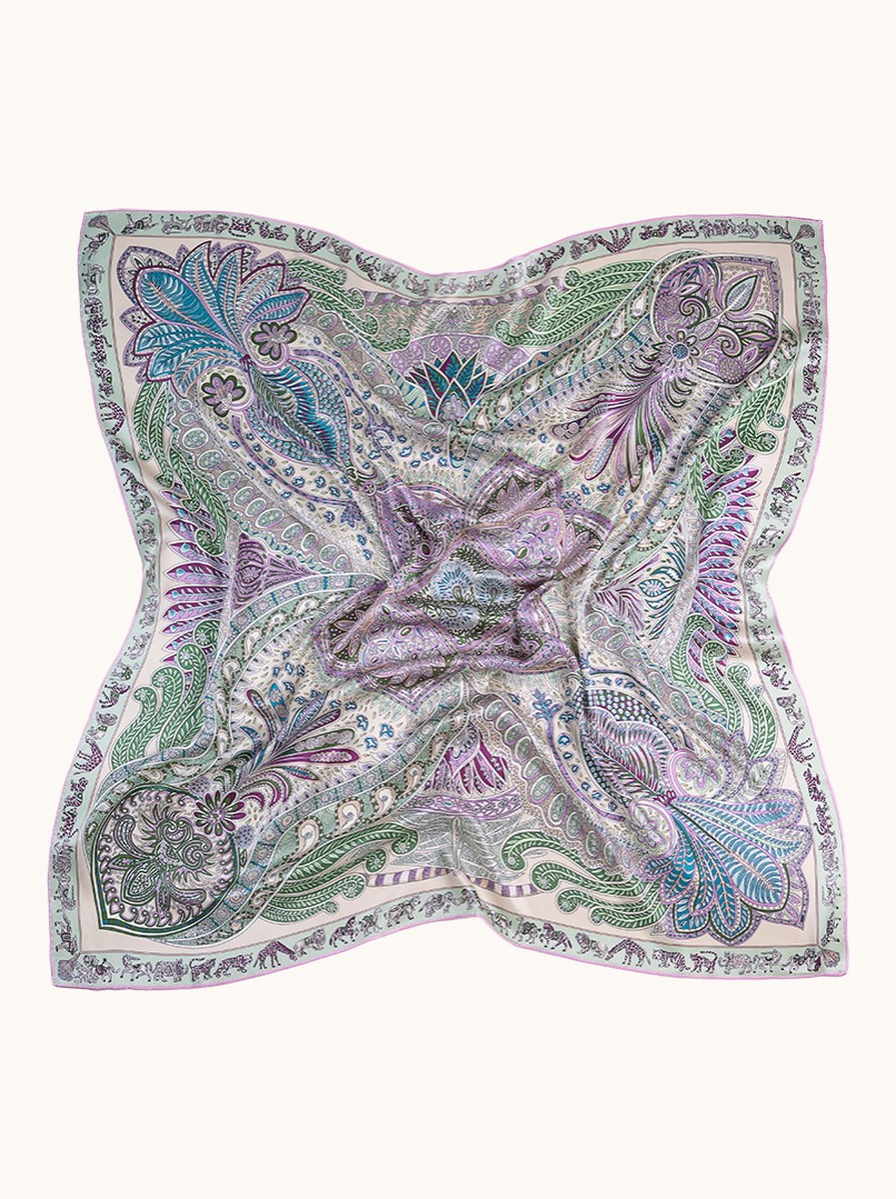 Ekskluzywna chusta dwustronna wykonana w 100% z naturalnego jedwabiu zachwyca artystycznym wzorem paisley oraz subtelnym połączeniem pastelowych odcieni mięty, lawendy, błękitu i pudrowego różu.