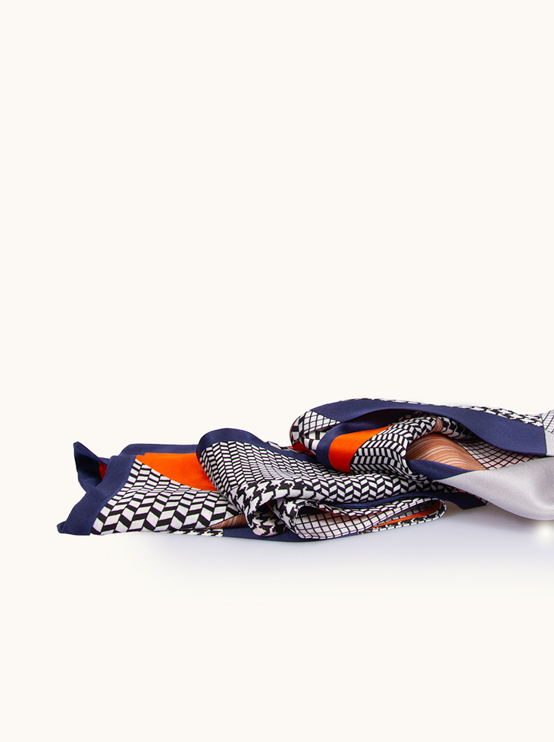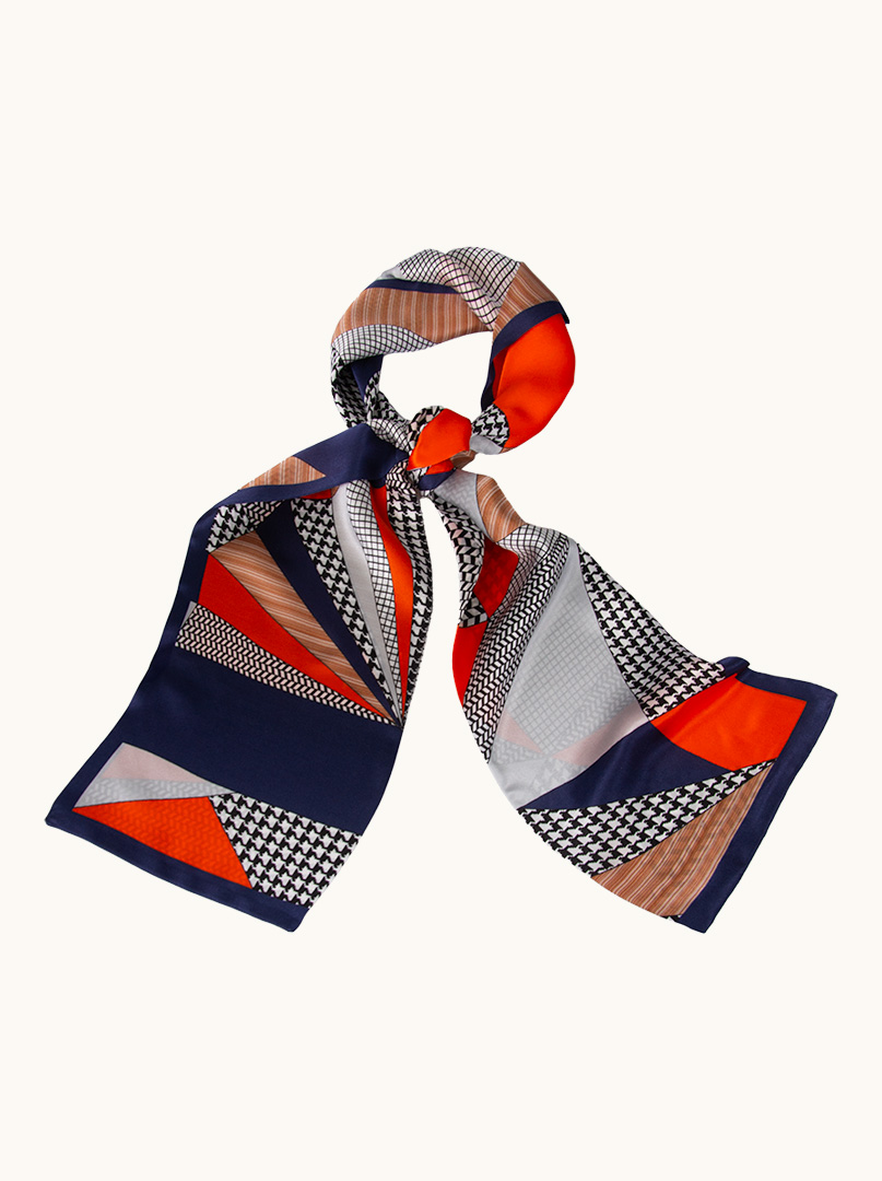 Szal o wymiarach 16 cm x 145 cm, wykonany z podwójnego jedwabiu, ozdobiony jest geometrycznymi wzorami na obu stronach i tworzy efektowną i elegancką opcję dla każdego, kto ceni sobie styl i wyrafinowanie.