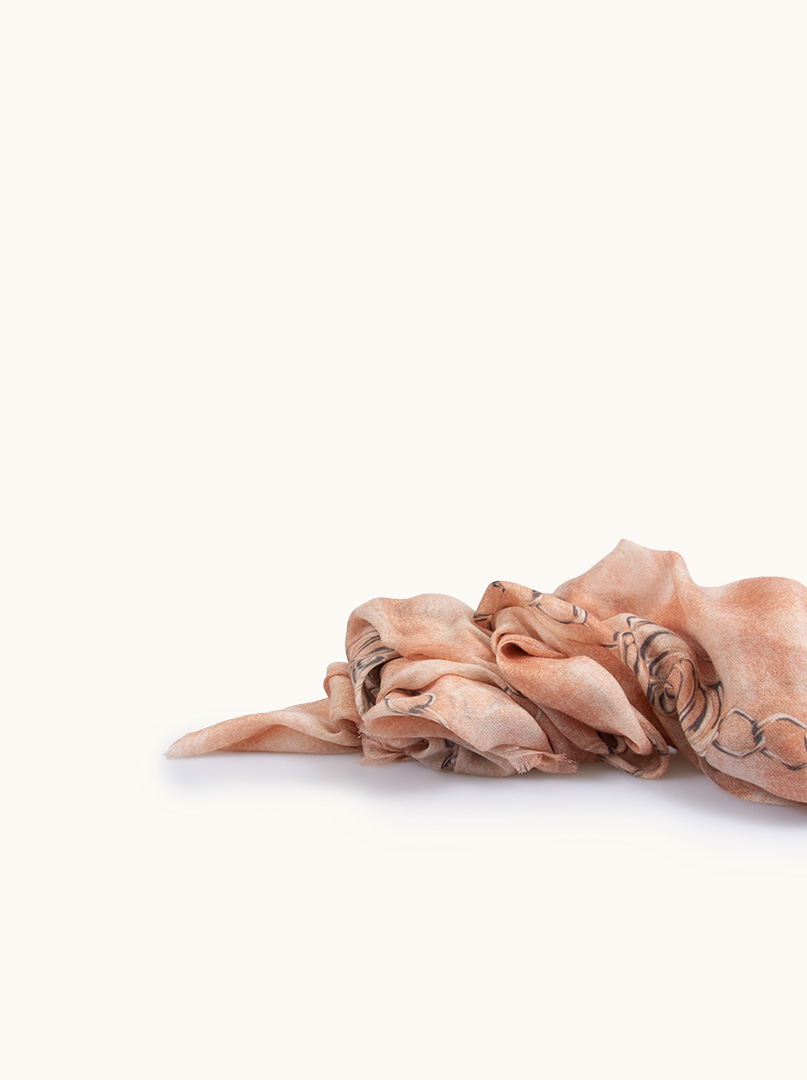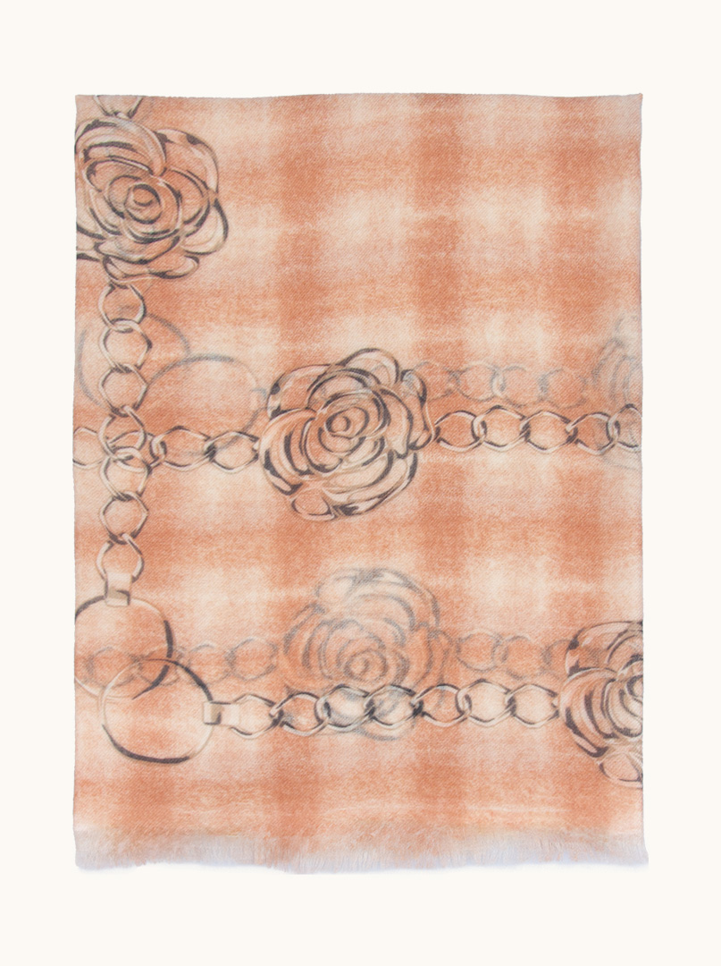 Romantyzm spotyka nowoczesność. Ten miękki szal z wełny urzeka połączeniem pastelowego tła w odcieniu brzoskwini i delikatnego printu z konturowanych róż oraz łańcuchów. Wygląda jak szkic z modowego notatnika – subtelny, a zarazem pełen charakteru. Idealny dla kobiet, które kochają dodatki z duszą.