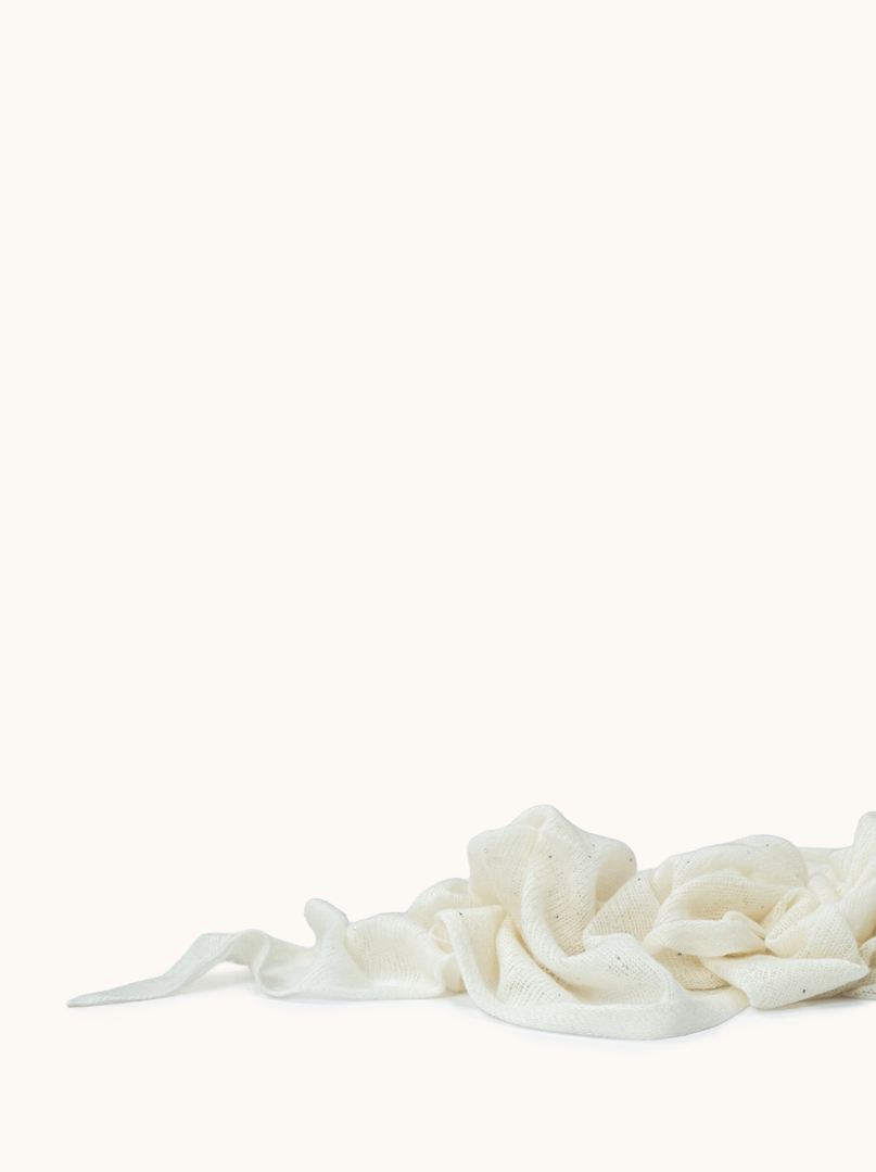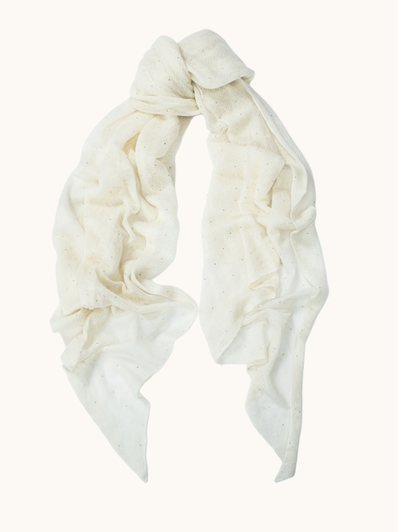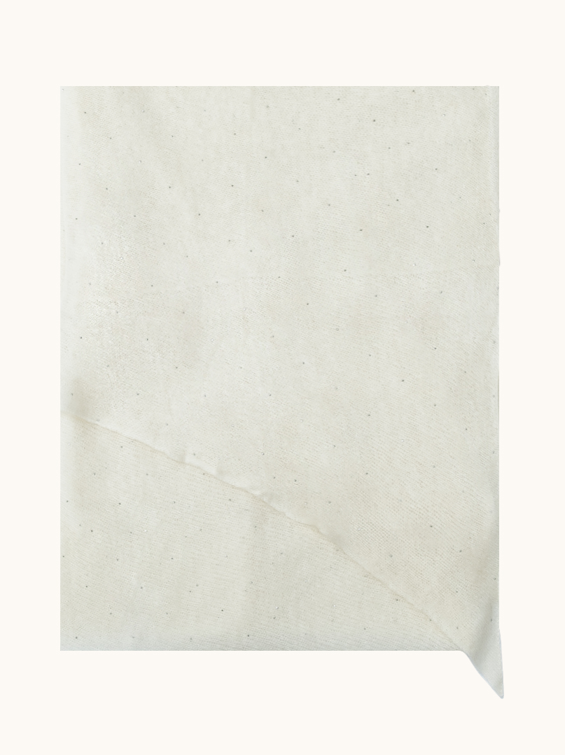 Kaszmir miękki jak poranna cisza, w odcieniu złamanej bieli, który robi wszystko za Ciebie – rozświetla twarz, uspokaja stylizację i wygląda drogo bez żadnego wysiłku. Subtelnie rozsypane dżety łapią światło przy każdym ruchu, ale robią to dyskretnie