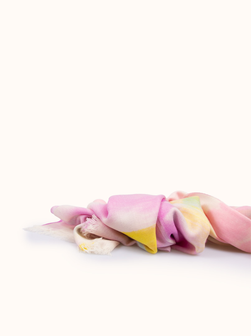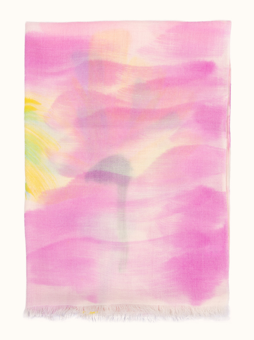 Jego delikatne połączenie różowego i żółtego tworzy harmonijną kompozycję kolorystyczną, która dodaje szalu świeżości i uroku. Dzięki swoim wymiarom szal ten jest wszechstronny w użyciu, można go nosić na wiele różnych sposobów - jako szalik do zawiązania wokół szyi, narzutkę na ramiona lub nawet jako ozdobę na torbie.