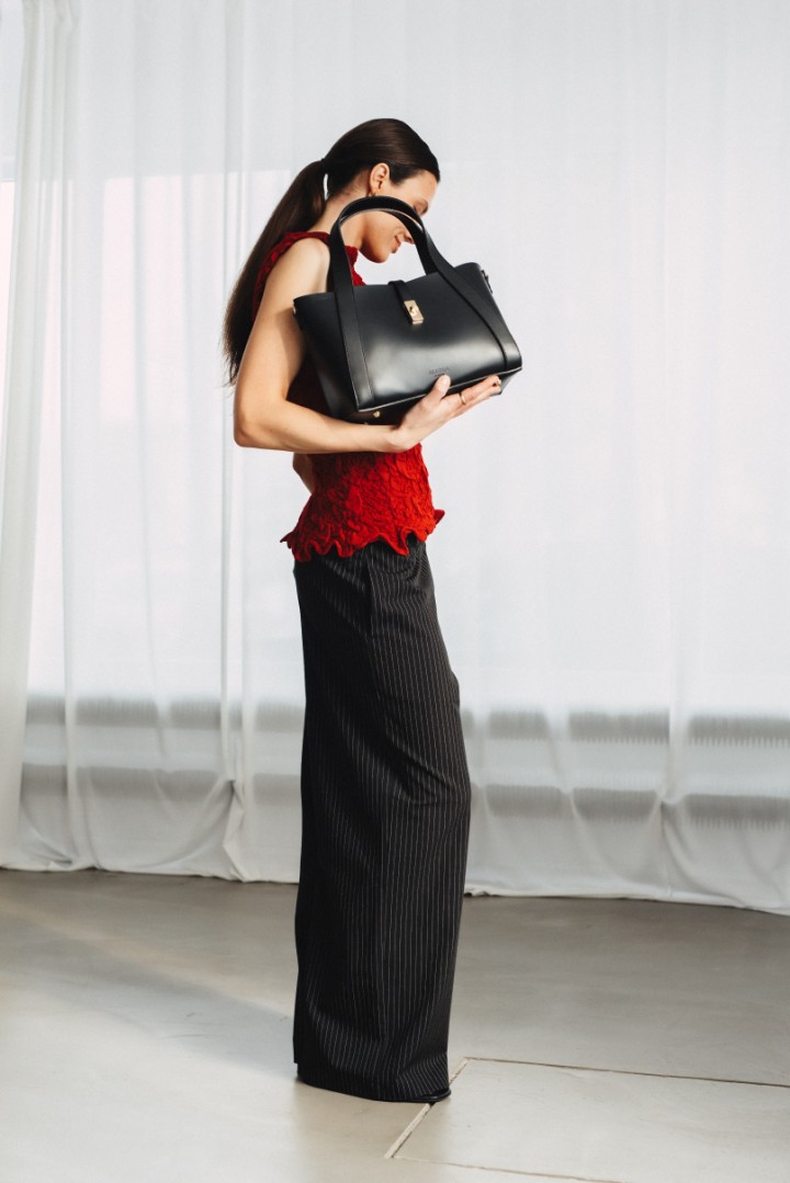 Wykonana z wysokiej jakości skóry naturalnej, ma prostą, nowoczesną formę z lekko architektoniczną linią. Matowe wykończenie skóry wygląda elegancko i bardzo „clean”, dzięki czemu torebka pasuje absolutnie do wszystkiego – od garnituru, przez minimalistyczną sukienkę, po codzienny look z jeansami i kaszmirem.