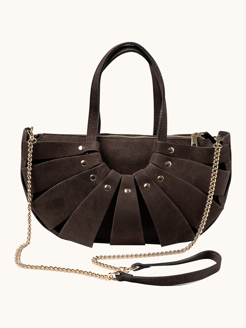 Jeśli szukasz zamszowej torebki w kolorze czekoladowym, z plecionym korpusem i złotym łańcuszkiem na ramię, ten model będzie doskonałym wyborem. Stylowa, dopracowana i ponadczasowa – dokładnie taka, którą chce się nosić często i długo.