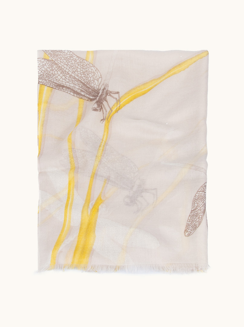 Kremowa baza przełamana subtelnym motywem ważek i akcentami w odcieniach złota oraz ciepłej żółci tworzy kompozycję lekką, świeżą i wyjątkowo kobiecą. To szal, który przyciąga detalem, ale pozostaje niezwykle elegancki.