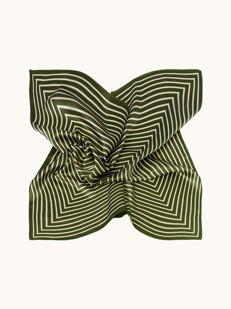 Apaszka w paski to połączenie elegancji i nowoczesnej geometrii. Wzór w kremowo-oliwkowe pasy układające się w kierunkowy szewron przyciąga wzrok i optycznie wysmukla stylizację. Wykonana z naturalnego jedwabiu, jest lekka, miękka i pięknie się układa – idealna do wiązania na szyi, przy włosach lub na uchwycie torebki. To dodatek, który wnosi świeżość i szyk do każdej garderoby.