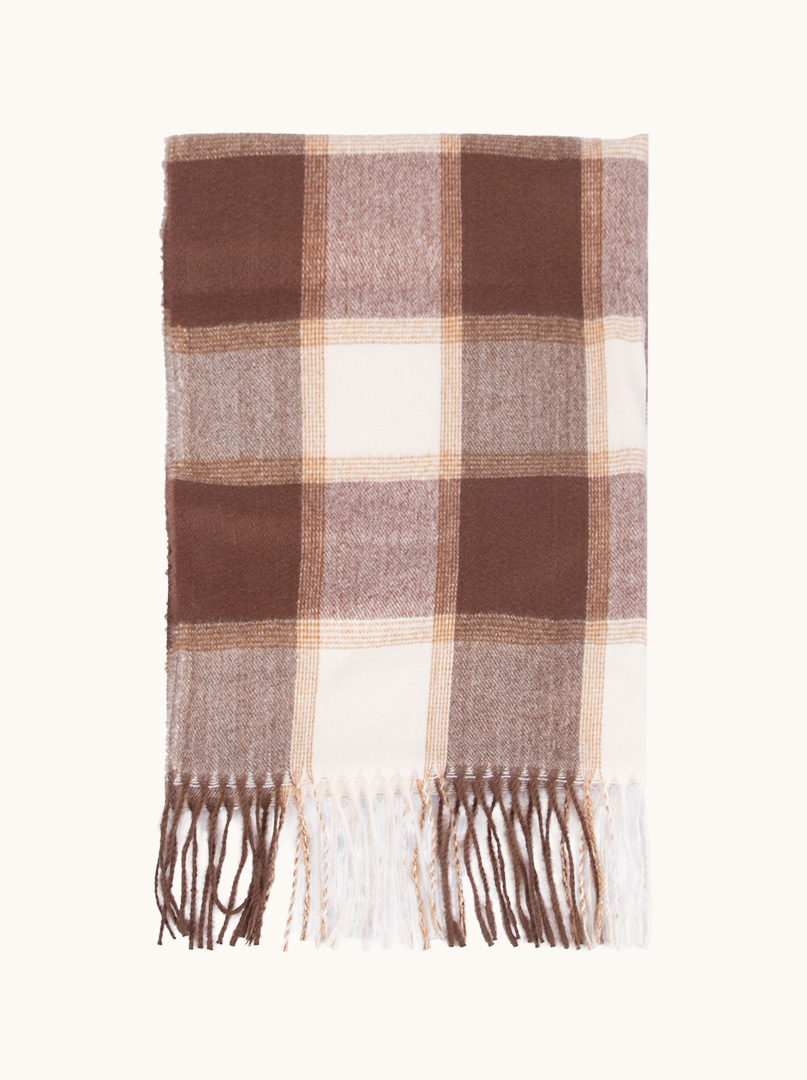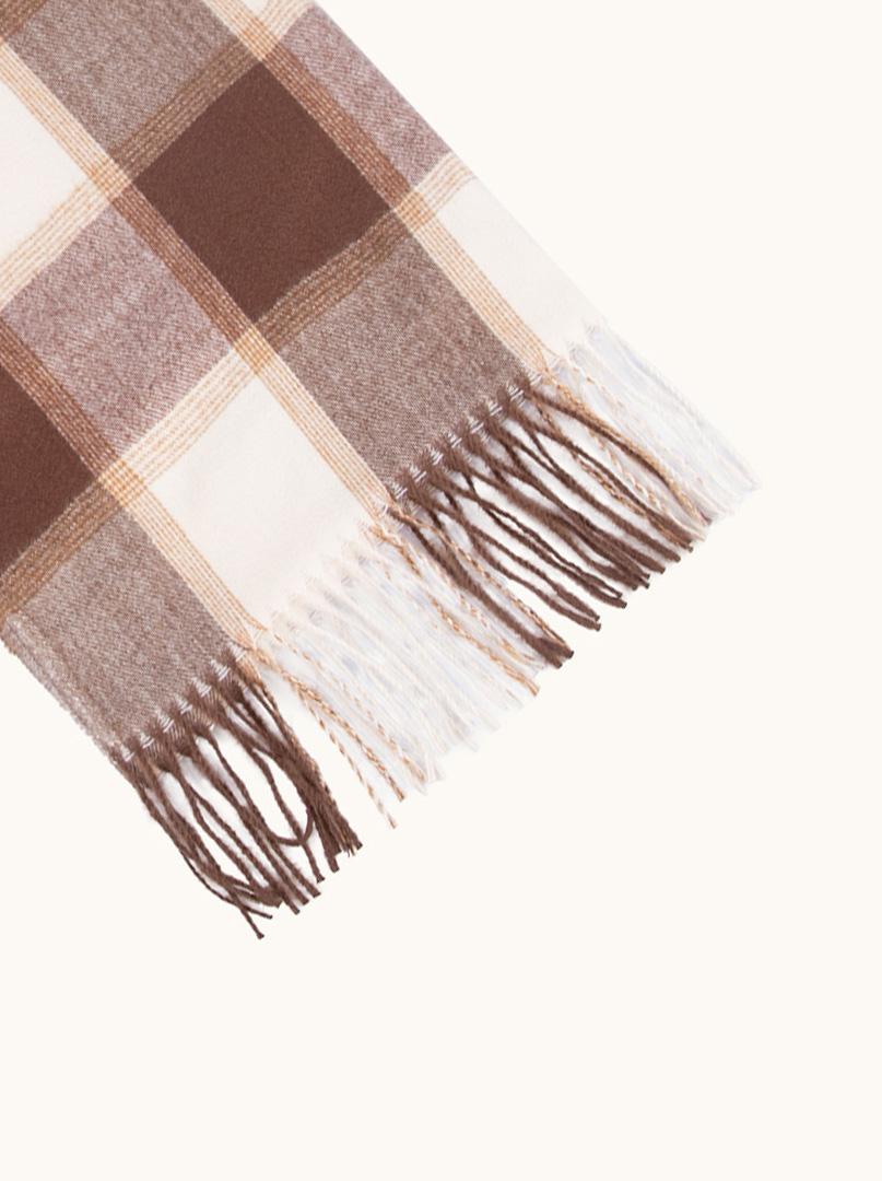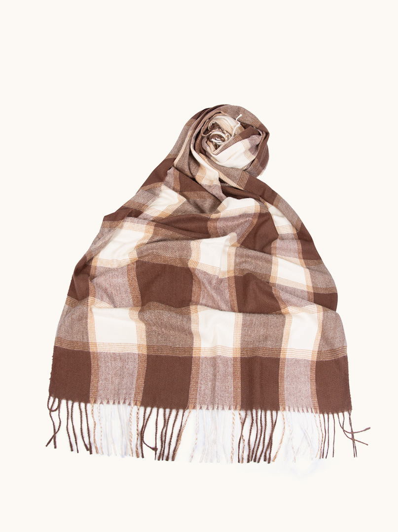 Szal ciepły brązowy w kratę beżową z frędzlami 65 cm x 180 cm
