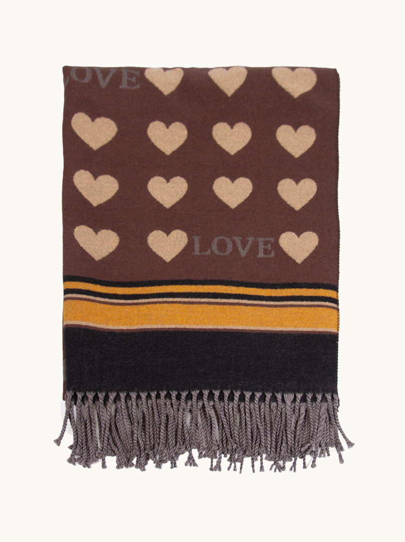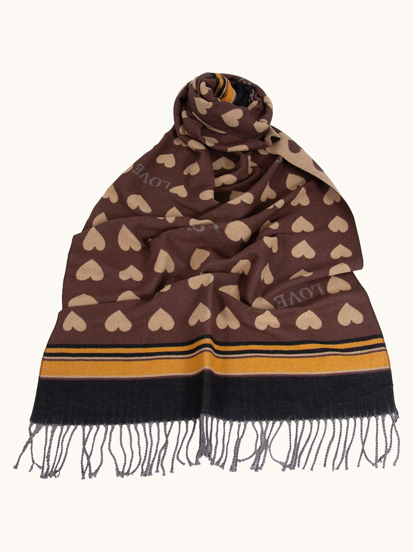 Ciepły szalik brązowy z motywem serca i napisem love, zakończony długimi, szarymi frędzlami. Wysokiej jakości szal damski z poliestru i wiskozy, przyjemny w dotyku.