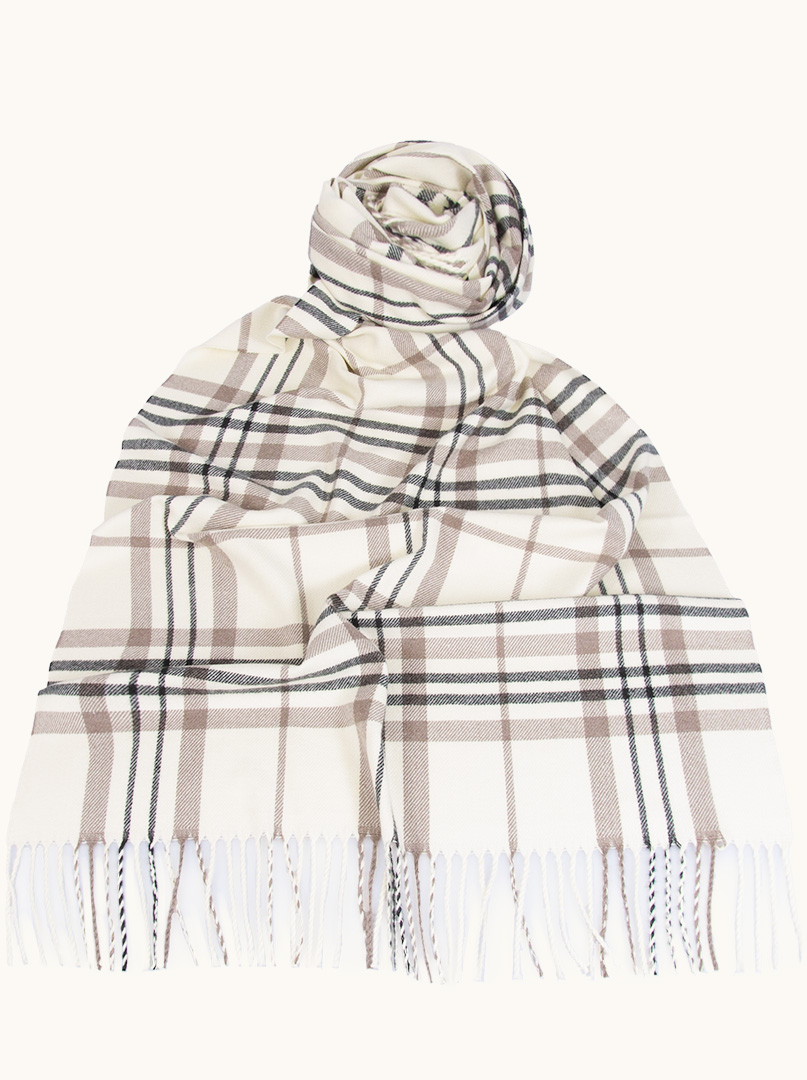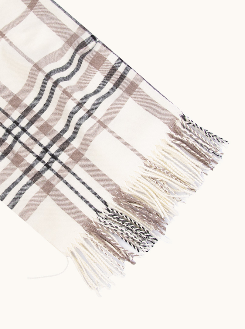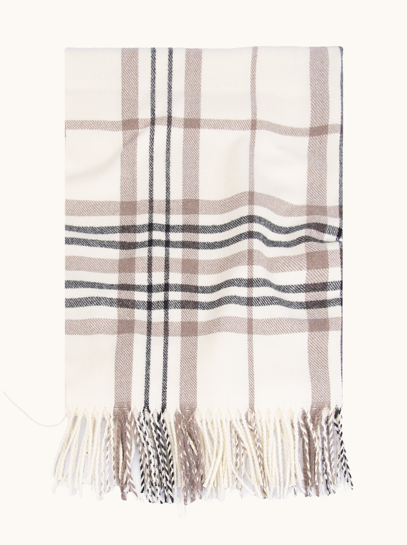 Ciepły szalik kremowy w beżowo-czarną kratę, zakończony długimi, z frędzlami. Wysokiej jakości szal damski z poliestru i wiskozy, przyjemny w dotyku.