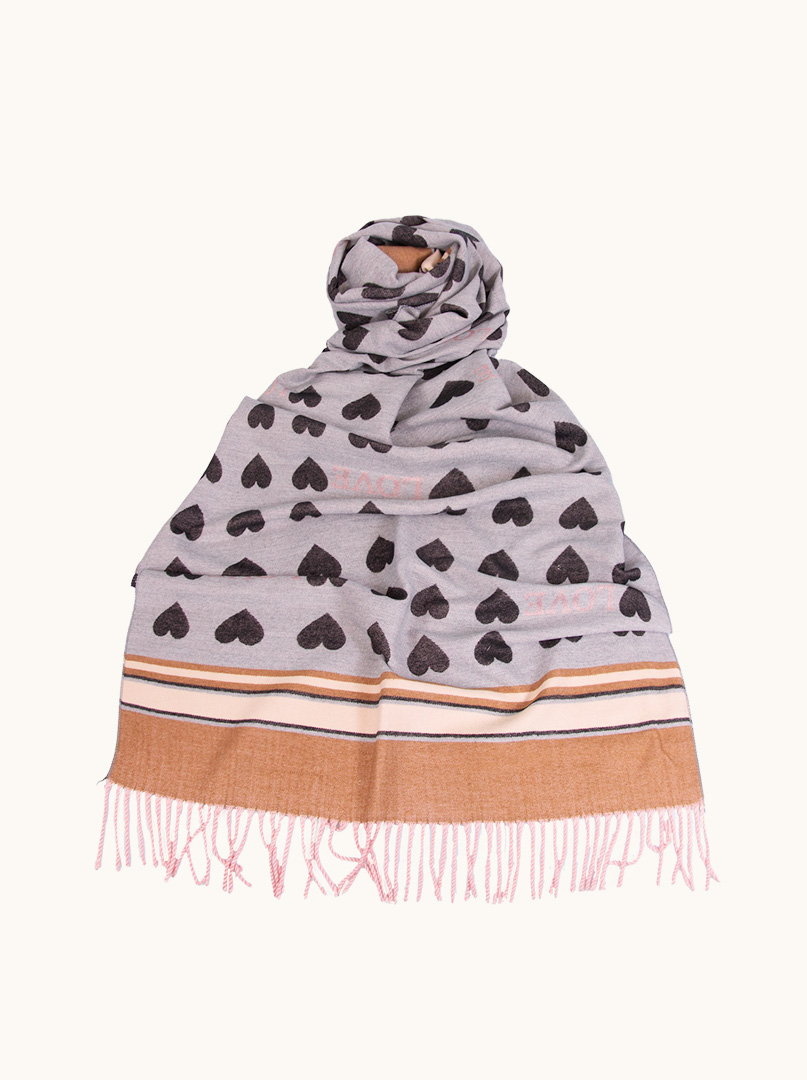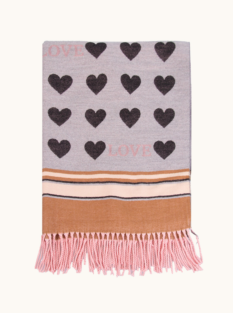 Ciepły szalik szary melanż z motywem serca i napisem love, zakończony długimi, różowymi frędzlami. Wysokiej jakości szal damski z poliestru i wiskozy, przyjemny w dotyku.