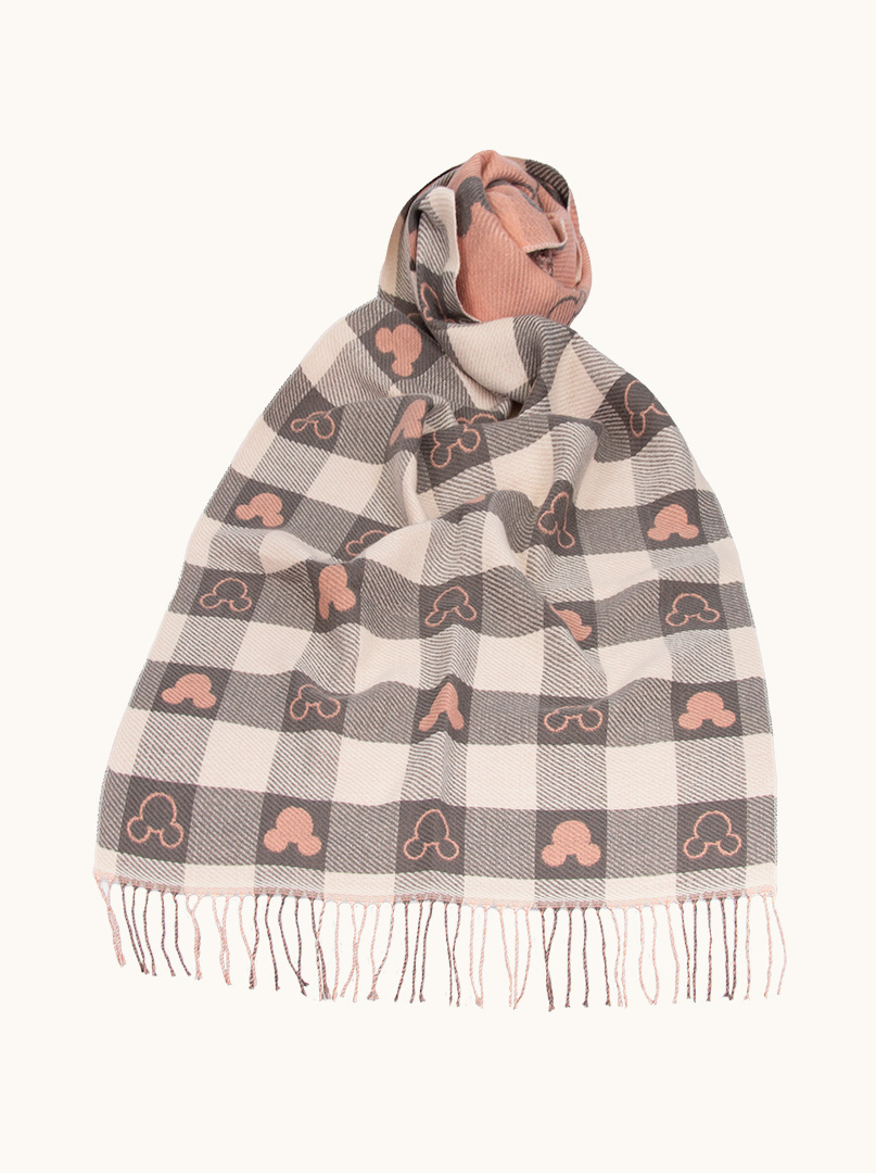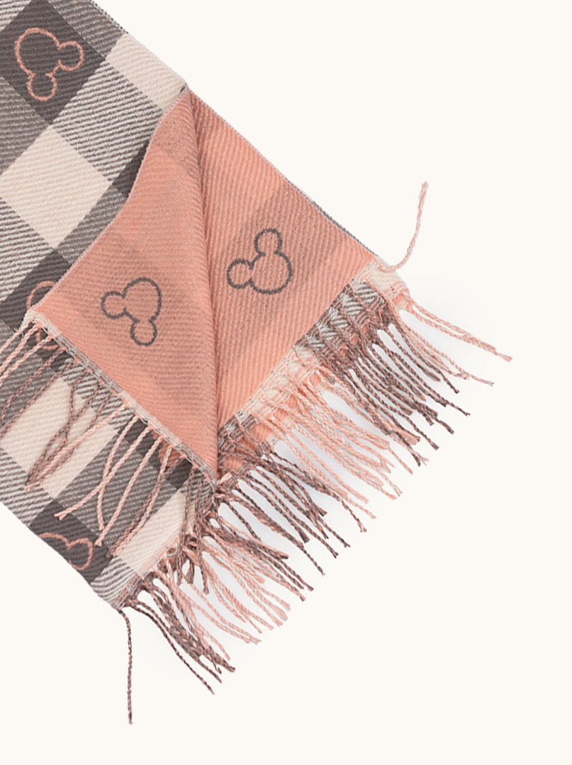 Ciepły szalik w kratę różowo-szarą Myszka Miki, zakończony długimi frędzlami. Wysokiej jakości szal damski z wiskozy i poliestru, przyjemny w dotyku.