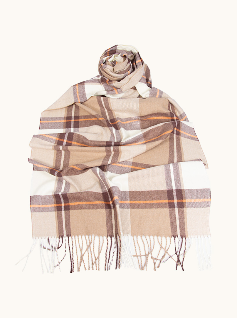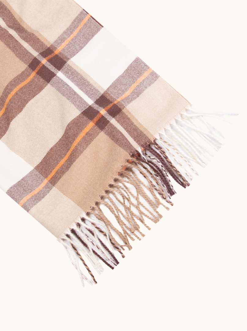 Ciepły gruby szalik w kratę beżowo-kremową, zakończony długimi frędzlami. Wysokiej jakości szal damski z poliestru i wiskozy, przyjemny w dotyku, zapewnia znakomitą ochronę przed zimnem i wiatrem. Dzięki swojej grubości i gęsto tkanej strukturze, utrzymuje ciepło ciała i chroni przed ekstremalnymi warunkami pogodowymi.