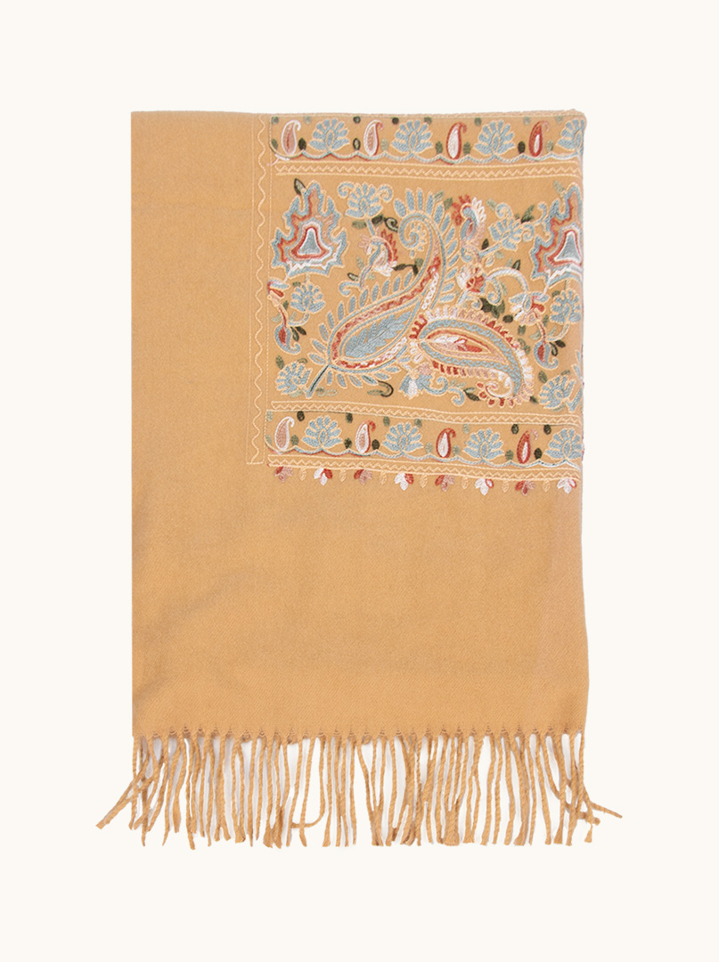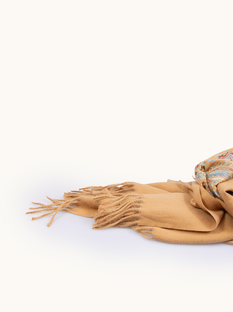 Ciepły szalik wełniany beżowy z wyszywanym motywem w paisley.. Wysokiej jakości szal damski z wełny, charakteryzujący się dużą sprężystością i odpornością na zagniecenia